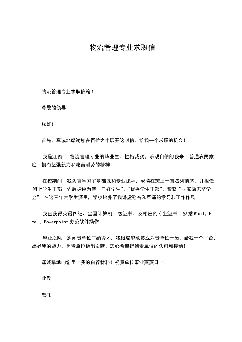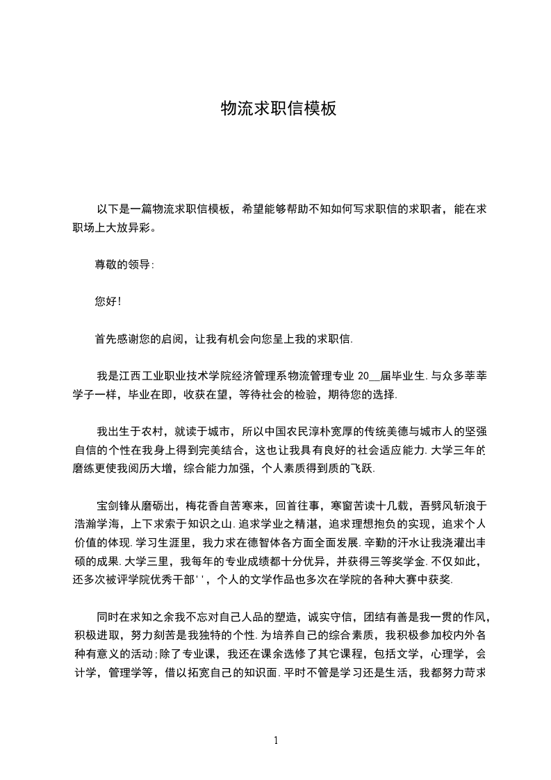 以下是一篇物流求职信模板,希望能够帮助不知如何写求职信的求职者,能在求职场上大放异彩。