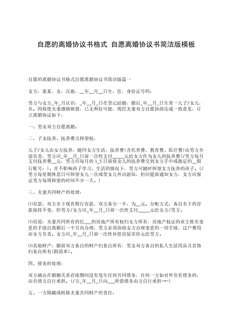 自愿的离婚协议书格式自愿离婚协议书简洁版篇二男方:_________(写明姓名、性别、年龄、民族、籍贯、职业或者工作单位和职务、住址、联系电话)