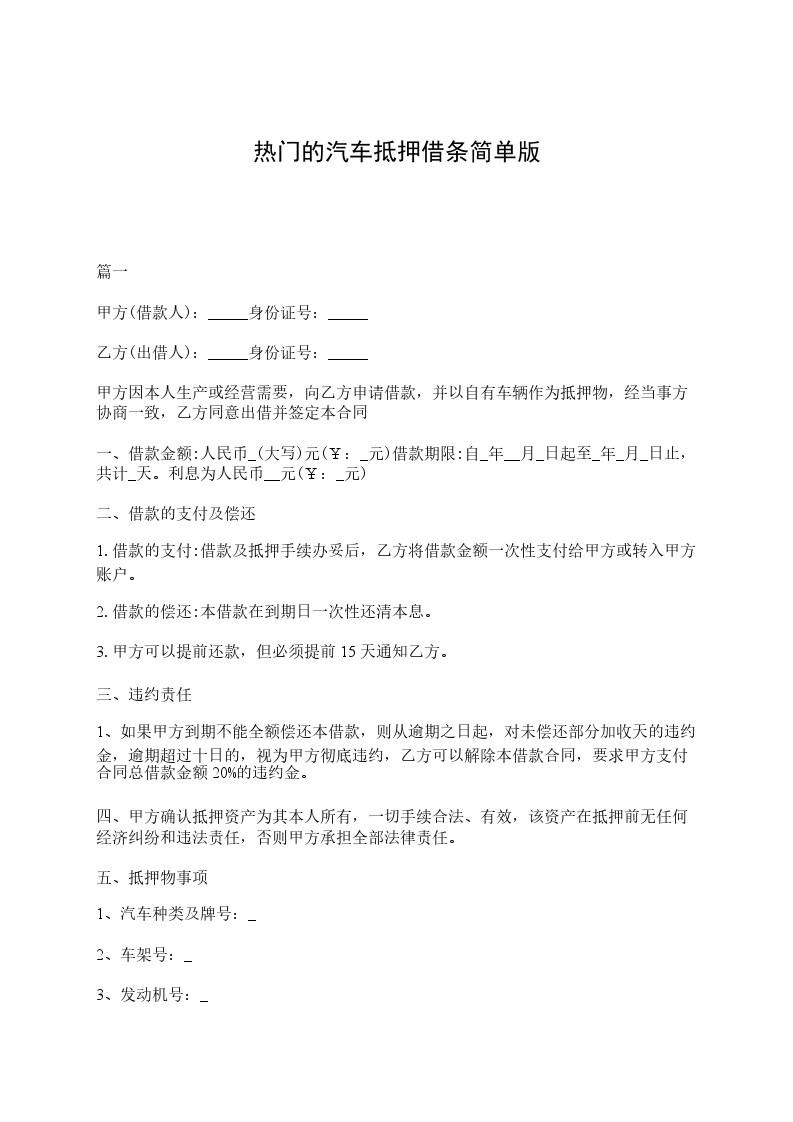 2.甲方如不能按时还款,自逾期天后,乙方则可以变卖抵押物以挽回损失。甲方签订本合同的同时签署同意逾期变卖的《委托书》。届时甲方违约,甲方同意乙方凭此《委托书》处置抵押车辆。