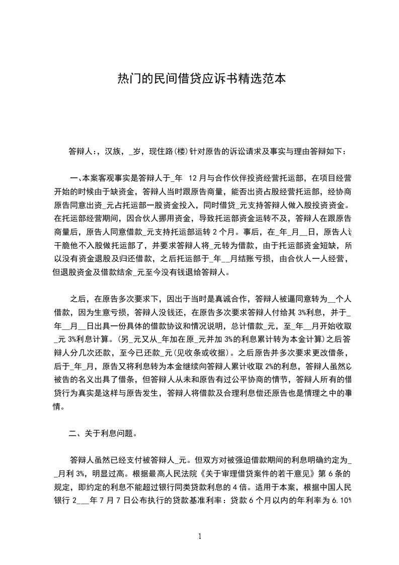之后,在原告多次要求下,因出于当时是真诚合作,答辩人被逼同意转为__个人借款,因为生意亏损,答辩人没钱还,在原告多次要求答辩人付给其3%利息,并于_年__月__日出具一份具体的借款协议和情况说明,总计借款_元,至_年__月开始收取_元3%利息计算。(另_元又从_年加在原_元并加3%的利息累计转为本金计算)之后答辩人分几次还款,至今已还款_元(见收条或收据)。之后原告并多次要求更改借条,后于_年_月,原告又将利息转为本金继续向答辩人累计收取2%的利息,答辩人虽然以被告的名义出具了借条,但答辩人从未和原告有过公平协商的情节,答辩人所有的借贷行为真实是这样与原告发生,答辩人将借款及合理利息偿还原告也是情理之中的事情。