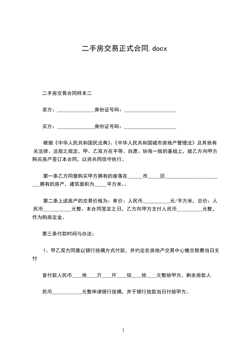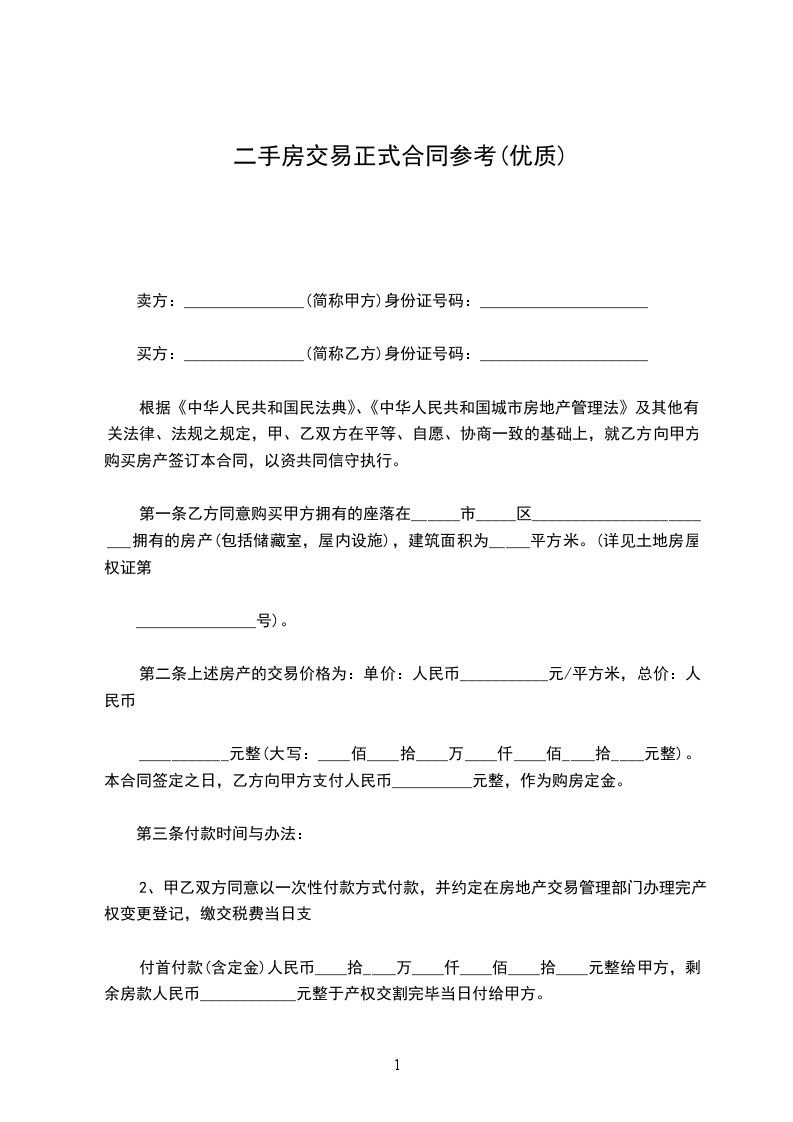 乙方于本合同签订当日内向甲方支付交首付款_______________万元(大写拾万仟佰元整),余款_______________元(大写拾万仟佰元整)在房屋过户手续办理完毕之日支付。