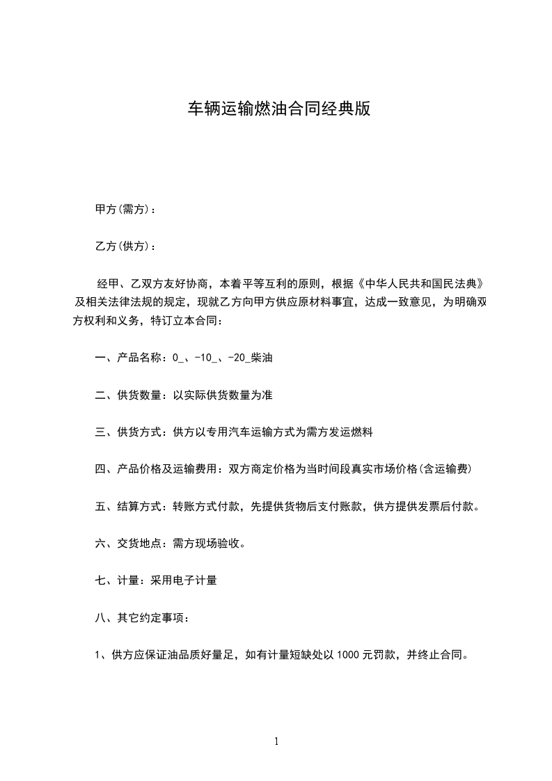 1、供方应保证油品质好量足,如有计量短缺处以1000元罚款,并终止合同。