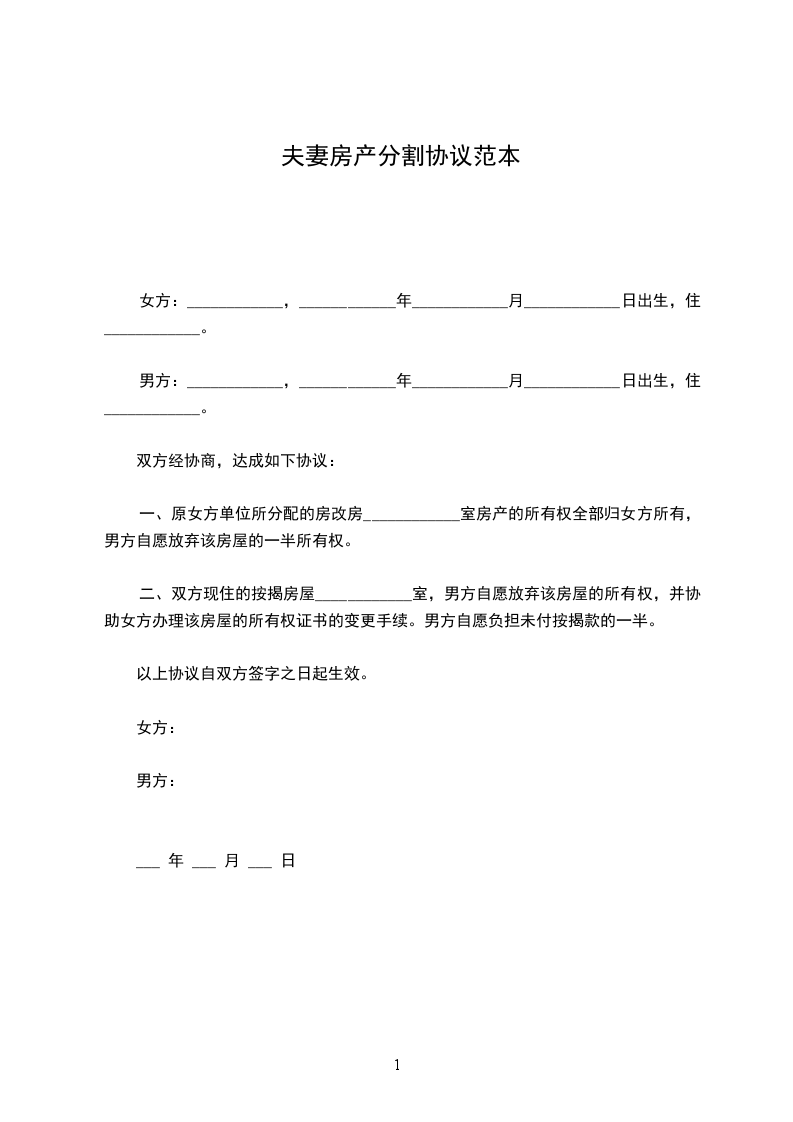 1、婚前各自名下的财产归各自所有,婚后财产(包括但不限现金、股票、期货、房产等)归男方所有,女方可取走己方的私人物品。