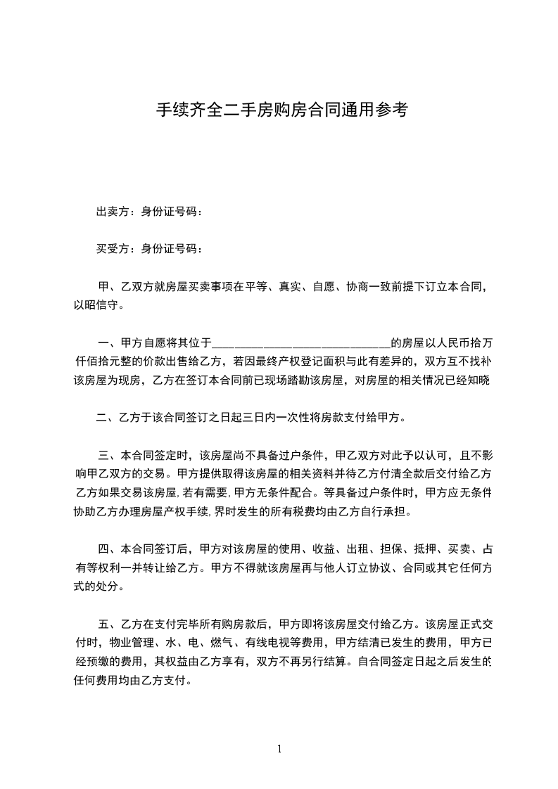 一、甲方自愿将其位于_______________________________的房屋以人民币拾万仟佰拾元整的价款出售给乙方,若因最终产权登记面积与此有差异的,双方互不找补。该房屋为现房,乙方在签订本合同前已现场踏勘该房屋,对房屋的相关情况已经知晓。
