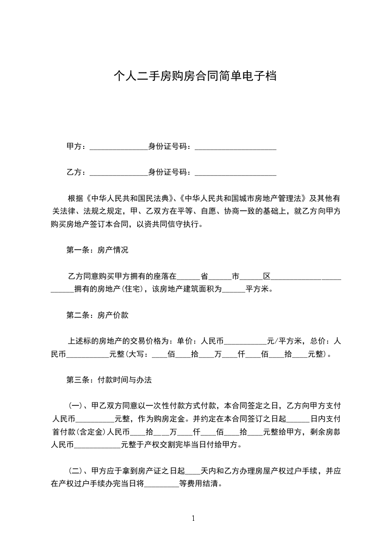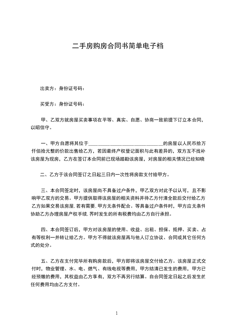 一、甲方自愿将其位于_______________________________的房屋以人民币拾万仟佰拾元整的价款出售给乙方,若因最终产权登记面积与此有差异的,双方互不找补。该房屋为现房,乙方在签订本合同前已现场踏勘该房屋,对房屋的相关情况已经知晓。