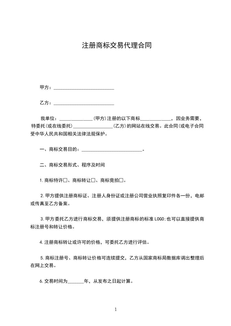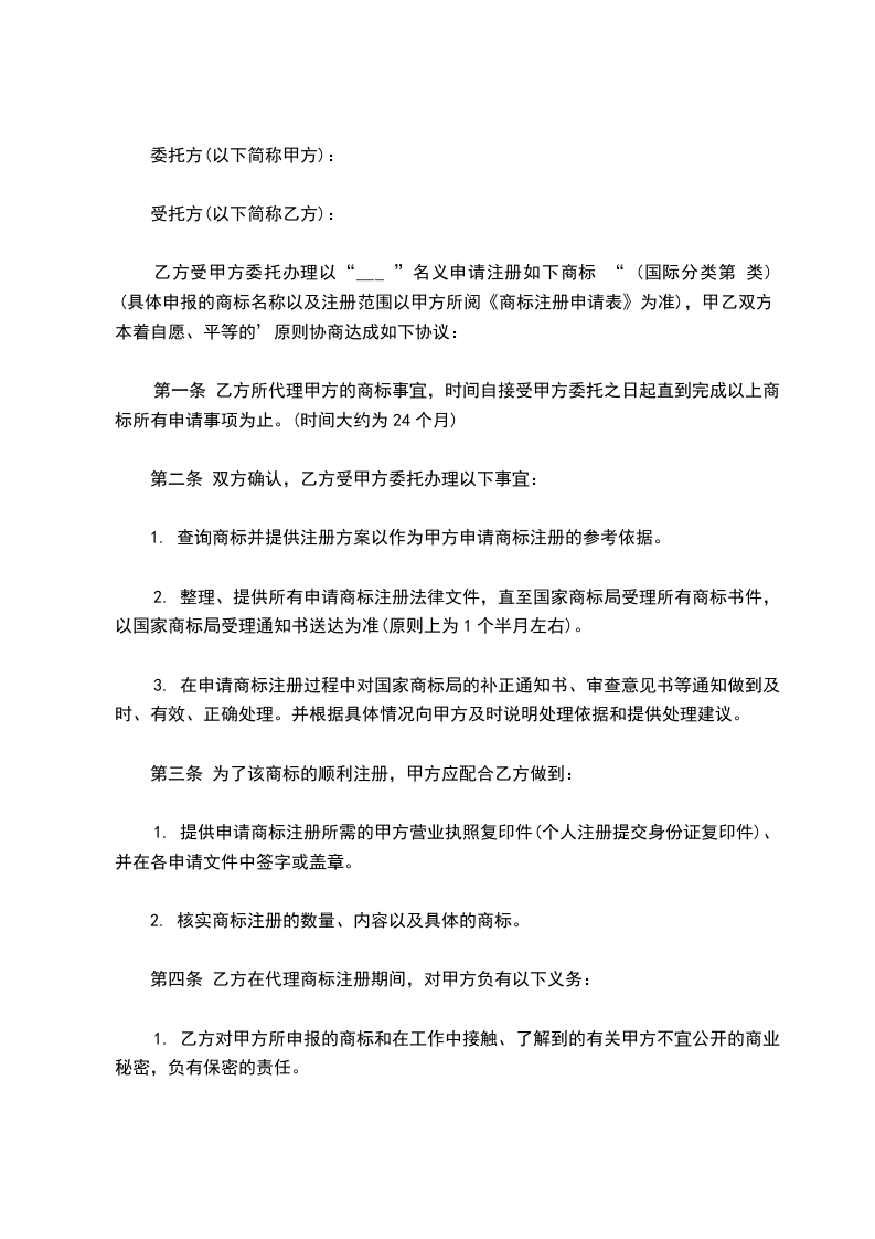 我单位:______________(甲方)注册的以下商标_____________,因业务需要,特委托(或在线委托)_________________(乙方)的网站在线交易。此合同(或电子合同)受中华人民共和国相关法律法规保护。