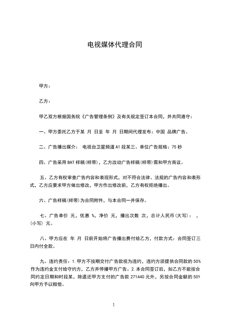 九、违约责任:1.甲方不按期交付广告款视为违约,违约方须提供合同款的50%作为违约金支付给守约方,乙方并停播甲方广告。2.本合同签订后,如乙方不能按合同约定日期和时段某,除退还甲方支付的广告款271440元外,另按合同金额的50%向甲方予以赔偿。