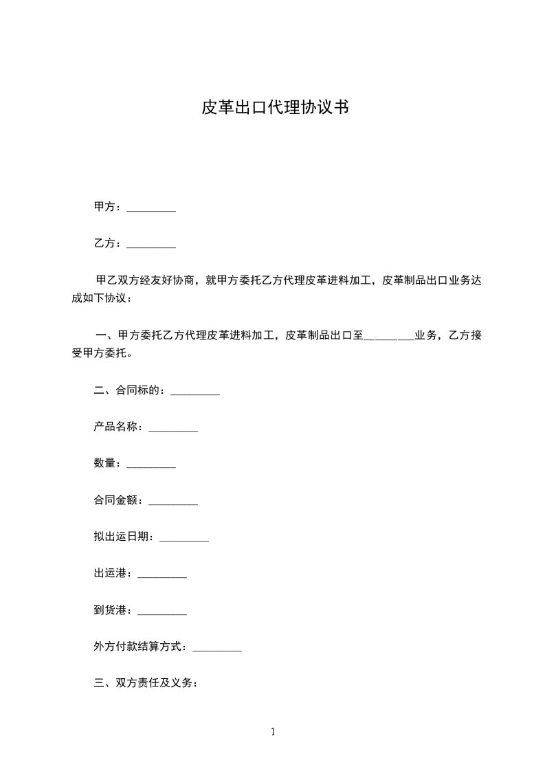 一、甲方委托乙方代理皮革进料加工,皮革制品出口至_________业务,乙方接受甲方委托。