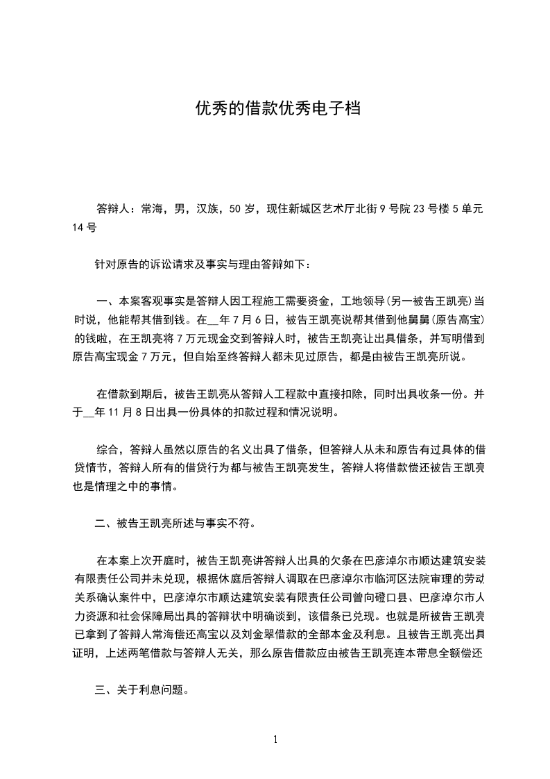 一、本案客观事实是答辩人因工程施工需要资金,工地领导(另一被告王凯亮)当时说,他能帮其借到钱。在__年7月6日,被告王凯亮说帮其借到他舅舅(原告高宝)的钱啦,在王凯亮将7万元现金交到答辩人时,被告王凯亮让出具借条,并写明借到原告高宝现金7万元,但自始至终答辩人都未见过原告,都是由被告王凯亮所说。