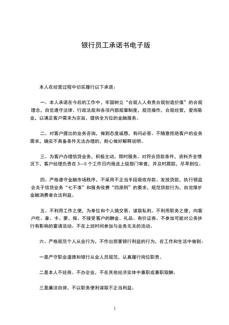 一、本人承诺在今后的工作中,牢固树立“合规人人有责合规创造价值”的合规理念,自觉遵守法律、行政法规和各项内部规章制度,规范操作,合规经营,爱岗敬业,以满足客户需求为宗旨,提供全方位的金融服务。