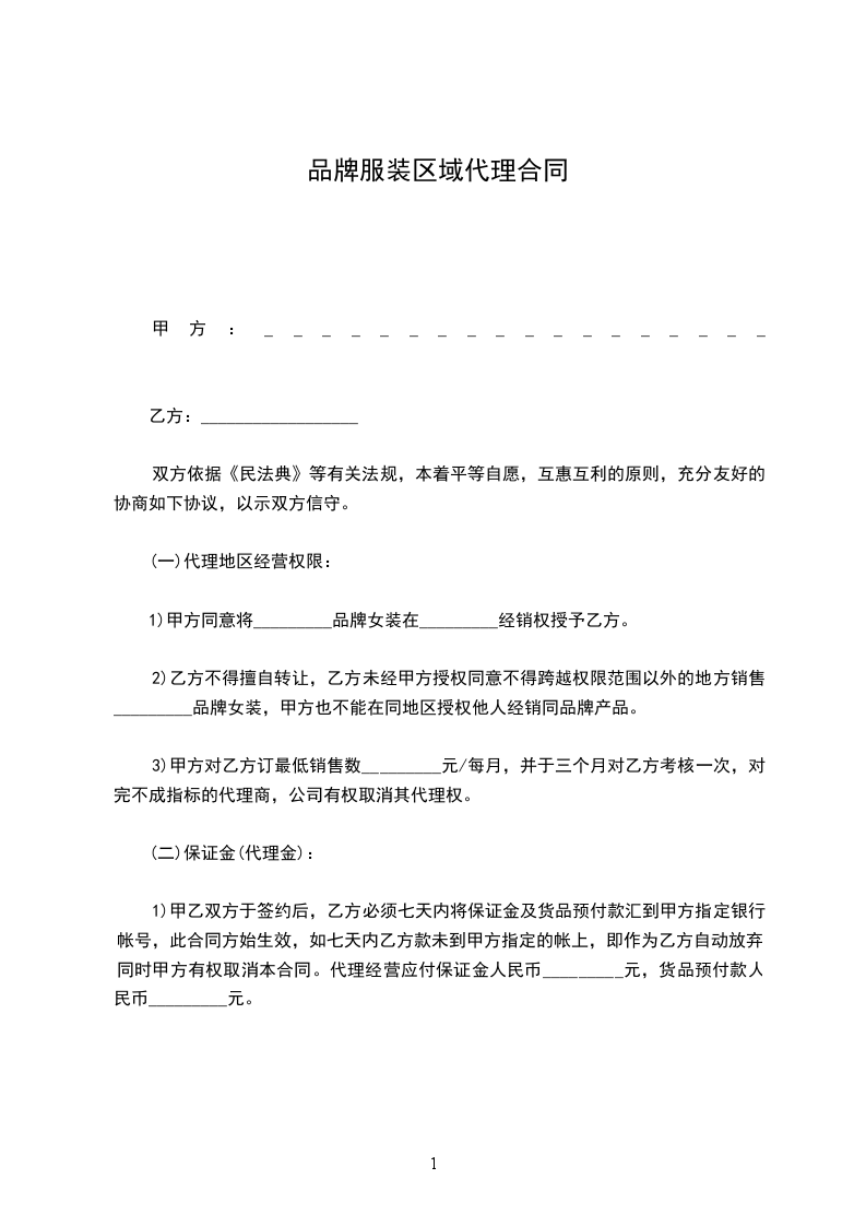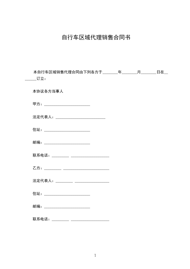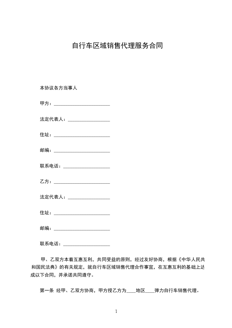 甲、乙双方本着互惠互利,共同受益的原则,经过友好协商,根据《中华人民共和国民法典》的有关规定,就自行车区域销售代理合作事宜,在互惠互利的基础上达成以下合同,并承诺共同遵守。