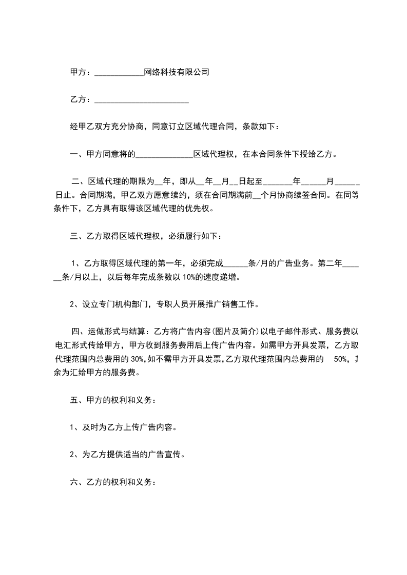 第七条 乙方必须在____个月以内建立本地区销售网络,并将零售商有关资料(地址、店名,联系电话)上报公司,以便共同协调管理市场。