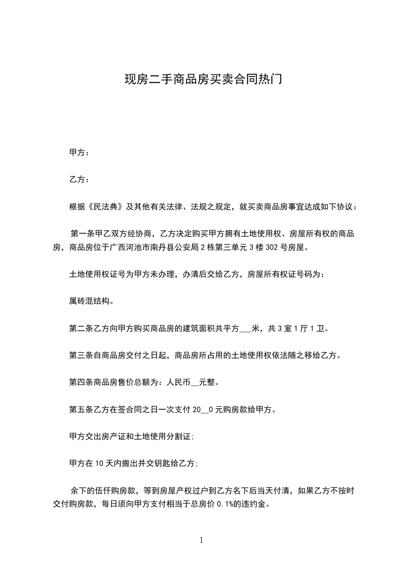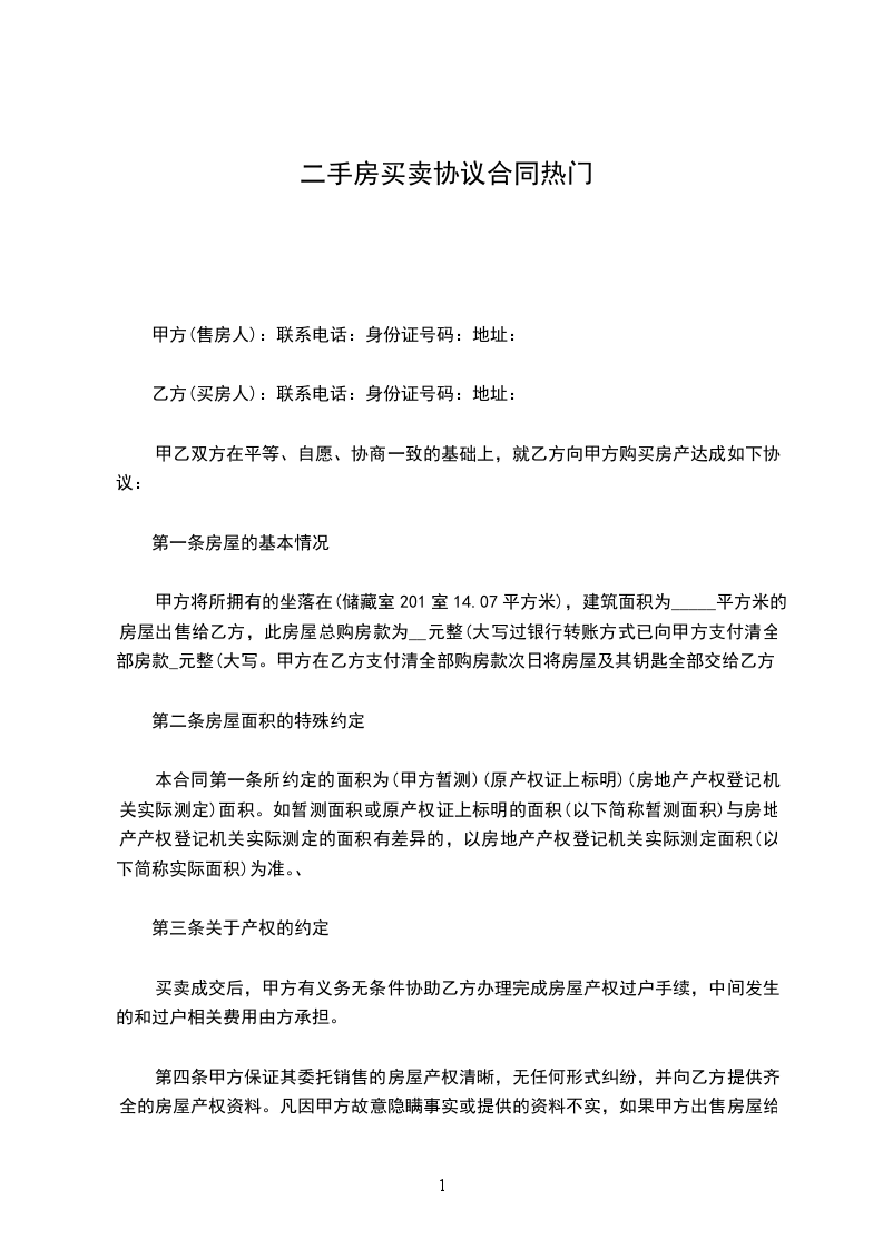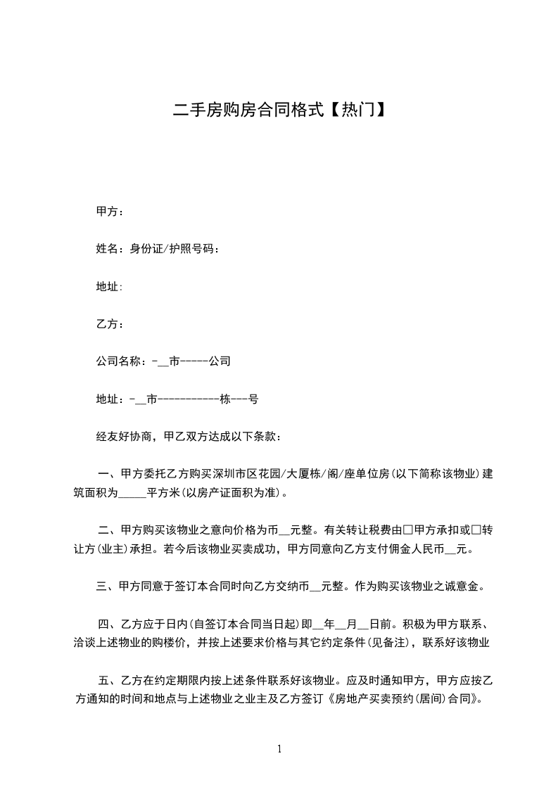一、甲方委托乙方购买深圳市区花园/大厦栋/阁/座单位房(以下简称该物业)建筑面积为_____平方米(以房产证面积为准)。