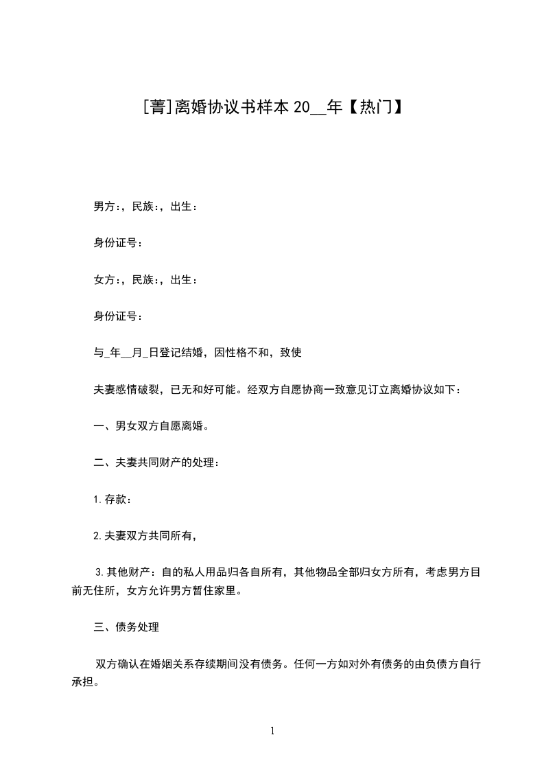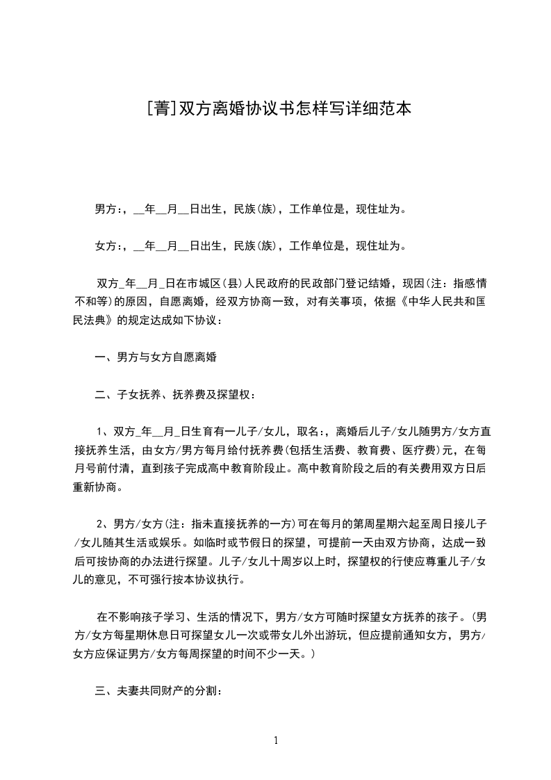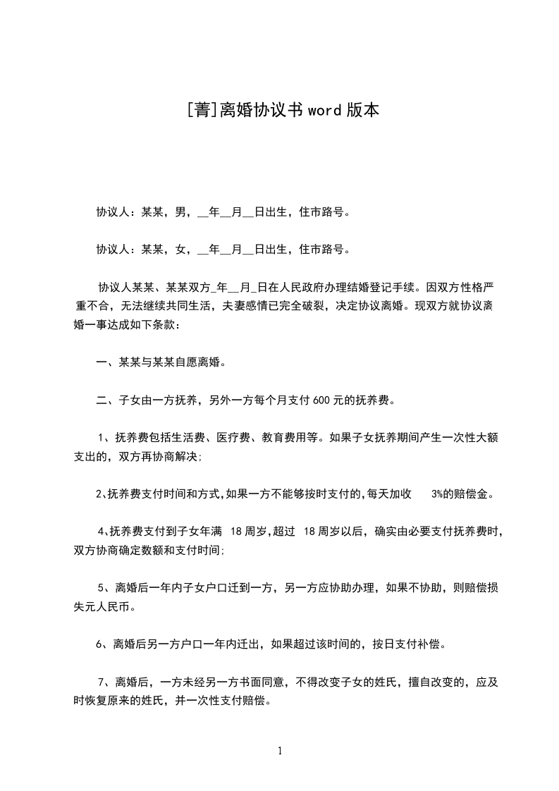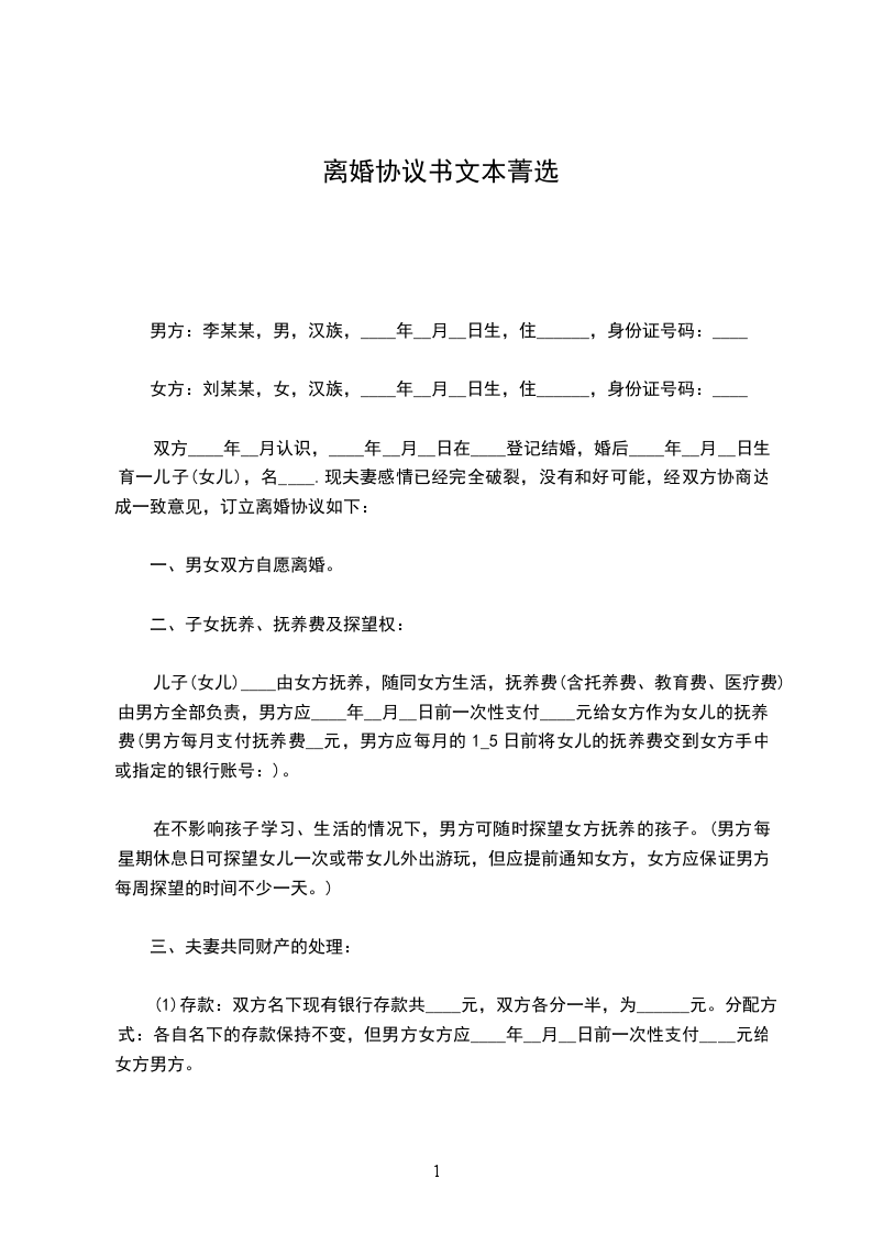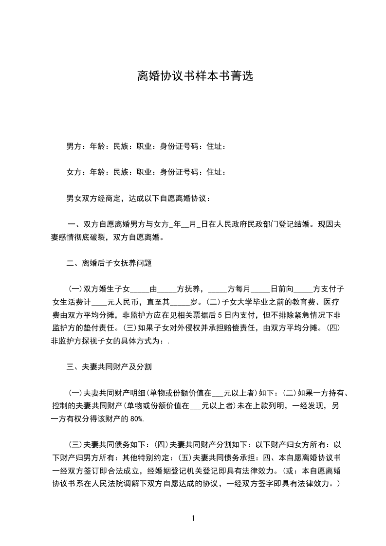 (三)夫妻共同债务如下:(四)夫妻共同财产分割如下:以下财产归女方所有:以下财产归男方所有:其他特别约定:(五)夫妻共同债务承担:四、本自愿离婚协议书一经双方签订即合法成立,经婚姻登记机关登记即具有法律效力。(或:本自愿离婚协议书系在人民法院调解下双方自愿达成的协议,一经双方签字即具有法律效力。)五、上述自愿离婚协议书事项,双方保证切实履行。因子女生活费、教育费、医疗费、对外赔偿等,延迟支付的一方应按日向全部垫付一方支付未支付金额千分之六的延期违约金。子女监护方阻止非监护方探视或不提供探视机会的,非监护方有权取得监护权,有权要求另一方支付精神损失赔偿金,精神损失赔偿金金额为监护方违约行为发生时的上年度全部收入。