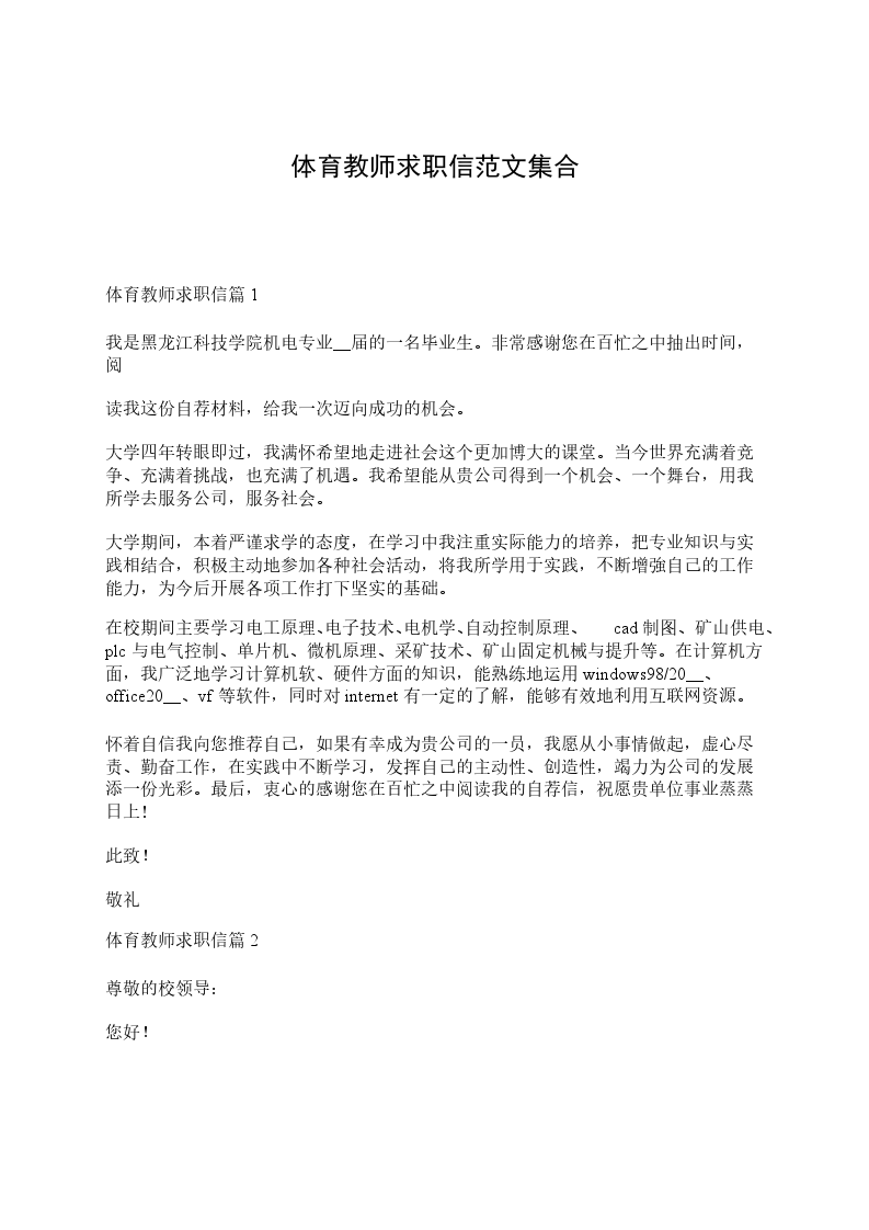 据悉,贵校正招聘一名体育教师,我希望申请这一职位。____年__月,我将从__师范大学毕业,并获得体育专业学士学位。大学的专业,使我获得许多体育专业知识,全面系统地掌握了体育学科中各专业的基本知识、基本技能和基本方法,具有较强的实际操作能力,我坚信,自己能胜任一名全面而优秀的体育教师。“勤奋创新,为人师表”,作为师范大学生的我,时刻牢记这一校训,为培养良好的个人修养,我不断磨练自己,积极参加校内外各项活动,自觉培养各方面的能力。2___年9月初,我们进行了为期四十天的实习,通过实地教学,使我不断在实践中完善自己,并结合当地的实际情况,自己创新了一种教学方法,受到许多老师的认可和赞扬。知识就是力量,随着社会的高速发展,在大学所学的东西已远远不能满足社会的需要,为充实自己、完善自己,我以满腔热情、积极进取的创业精神,为成为一名优秀的人民教师而奋斗着。虽然,我是一个即将毕业的教学新手,但我相信,有你们的栽培和熏陶,我也会和你们一样,做得比别人更好,我能用我出色的表现证明我的能力,证明您明智的选择。如果您对我的申请感兴趣,在您方便之时与我联系,我正期待您的答复。找范文