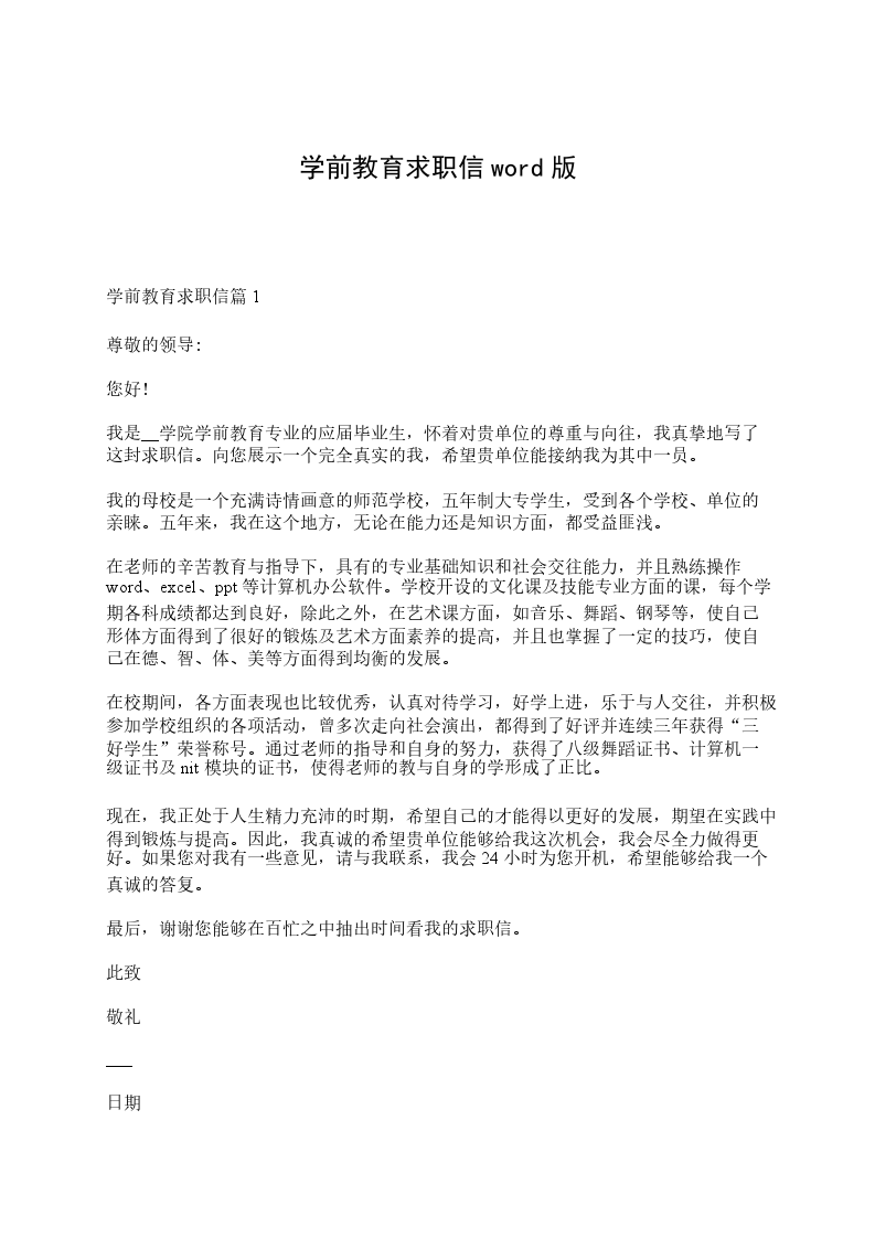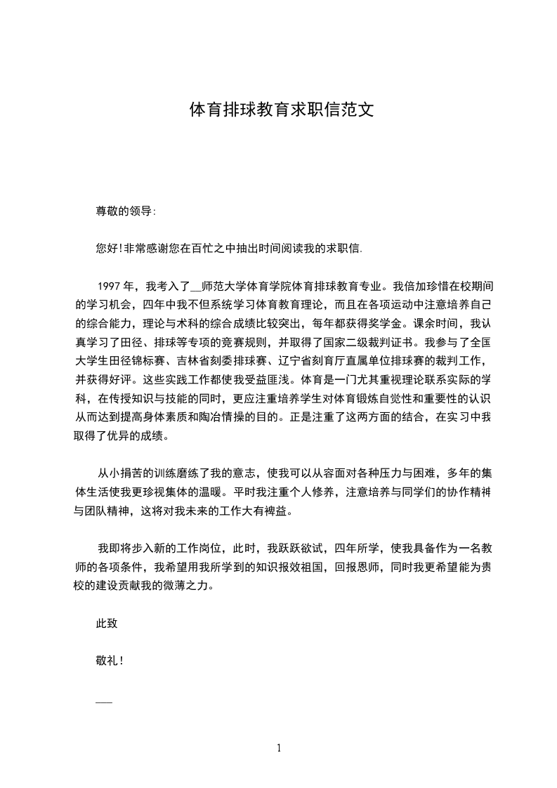 久闻该校对体育活动开展较为热烈,为了使自己的知识学有所用,使敬业精神得到体现,因此到贵校积极申请这一职位。我深信在你们的栽培和熏陶下,我一定会在工作岗位上实现人生价值,证明您明智的选择。敬请领导考核、审视。教练担任起院田径队中长跑的练习任务,从专项业务能力方面自己得到了充分发挥。自己不但专项突出,从第二专选及爱好方面发展自己的一技之长,如:大众健身操。武术、排球、乒乓球、唱歌等,力求做到一专多能。而且通过教育实习证实自己有较强的组织能力,教学能力,力求教学方面新疑有效,且在实习中取得了优异成绩。
