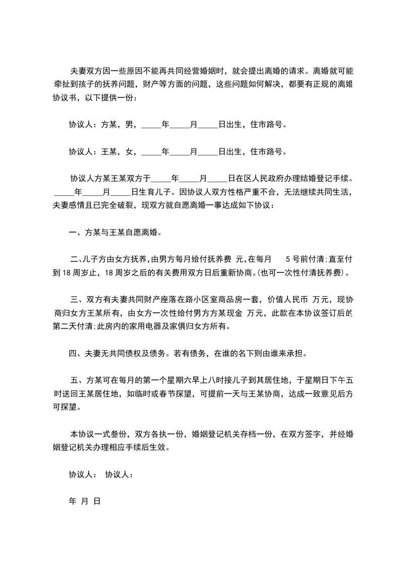 协议人方某王某双方于_____年_____月_____日在区人民政府办理结婚登记手续。_____年_____月_____日生育儿子。因协议人双方性格严重不合,无法继续共同生活,夫妻感情且已完全破裂,现双方就自愿离婚一事达成如下协议:
