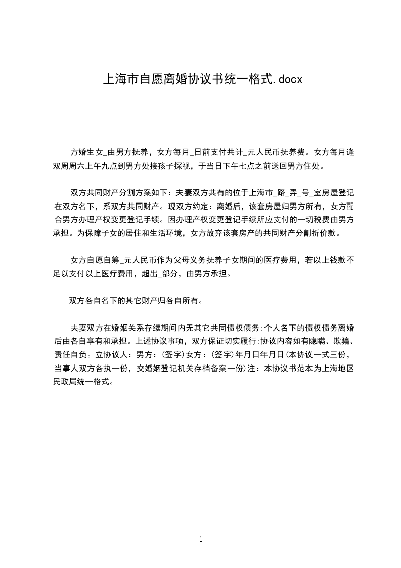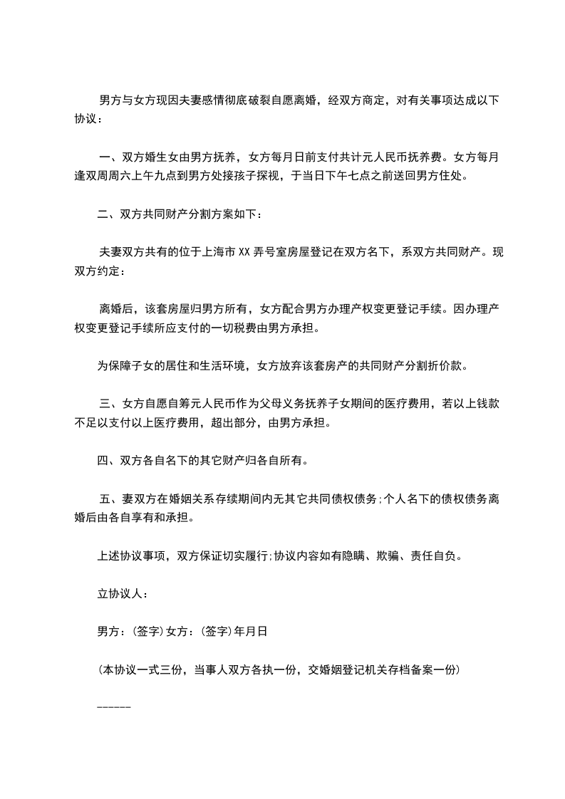 本协议一式叁份,双方各执一份,婚姻登记机关存档一份,在双方签字,并经婚姻登记机关办理相应手续后生效。