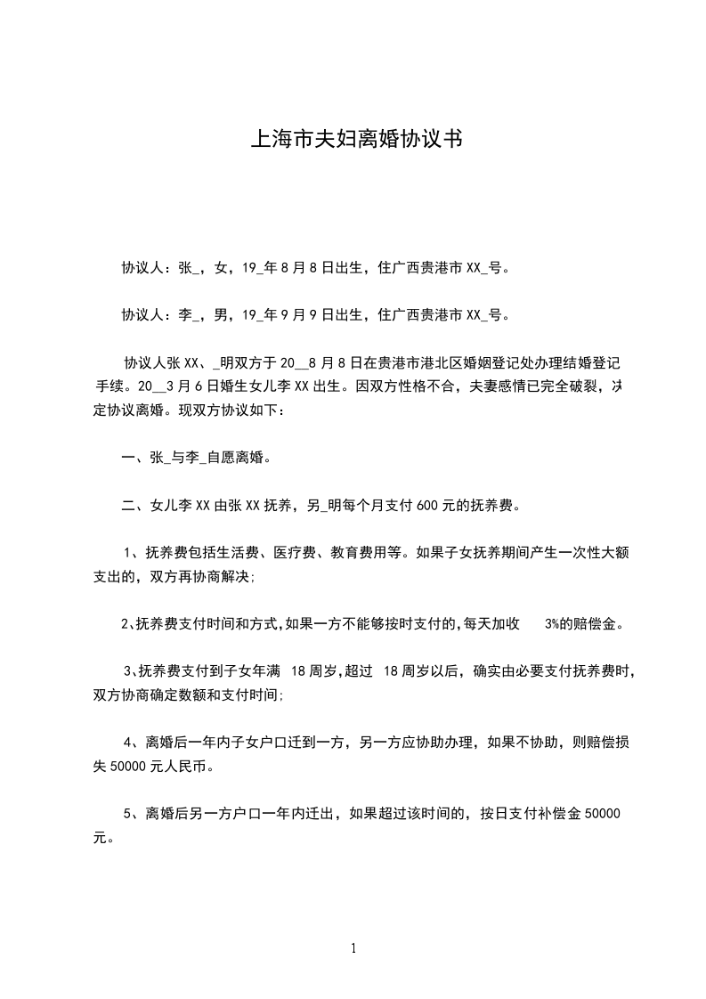 协议人:王某,女,_____年_____月_____日出生,住市路号。