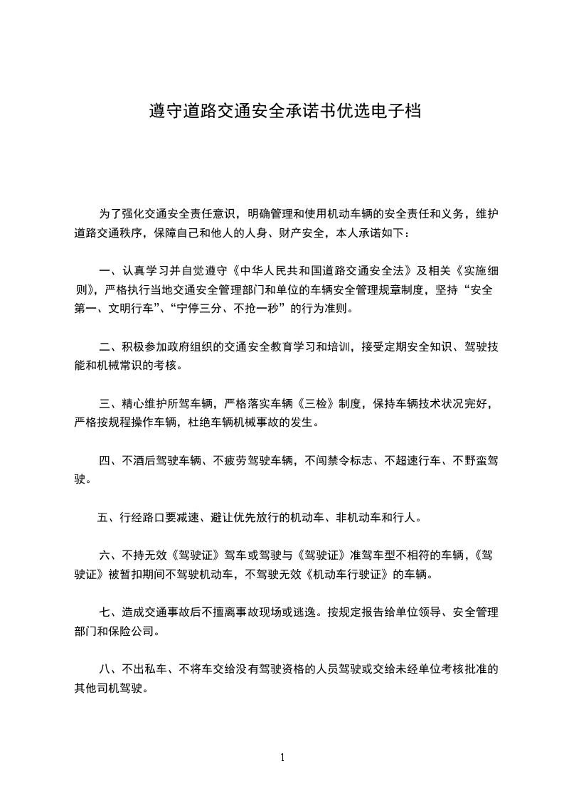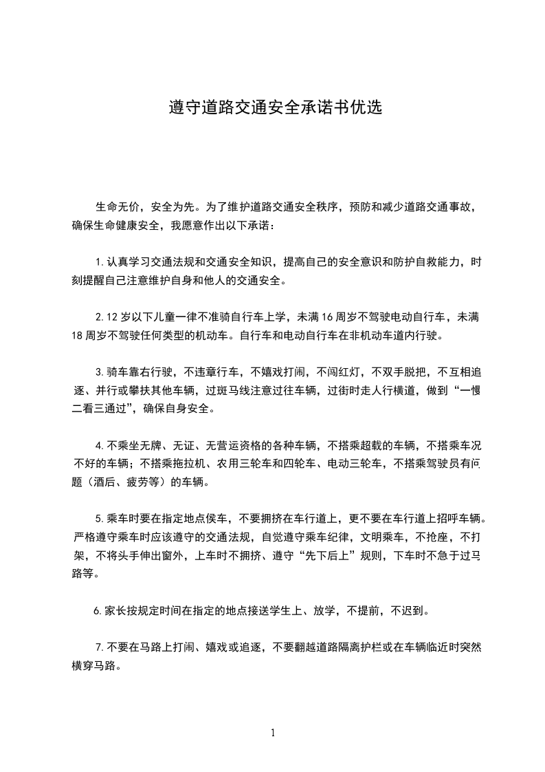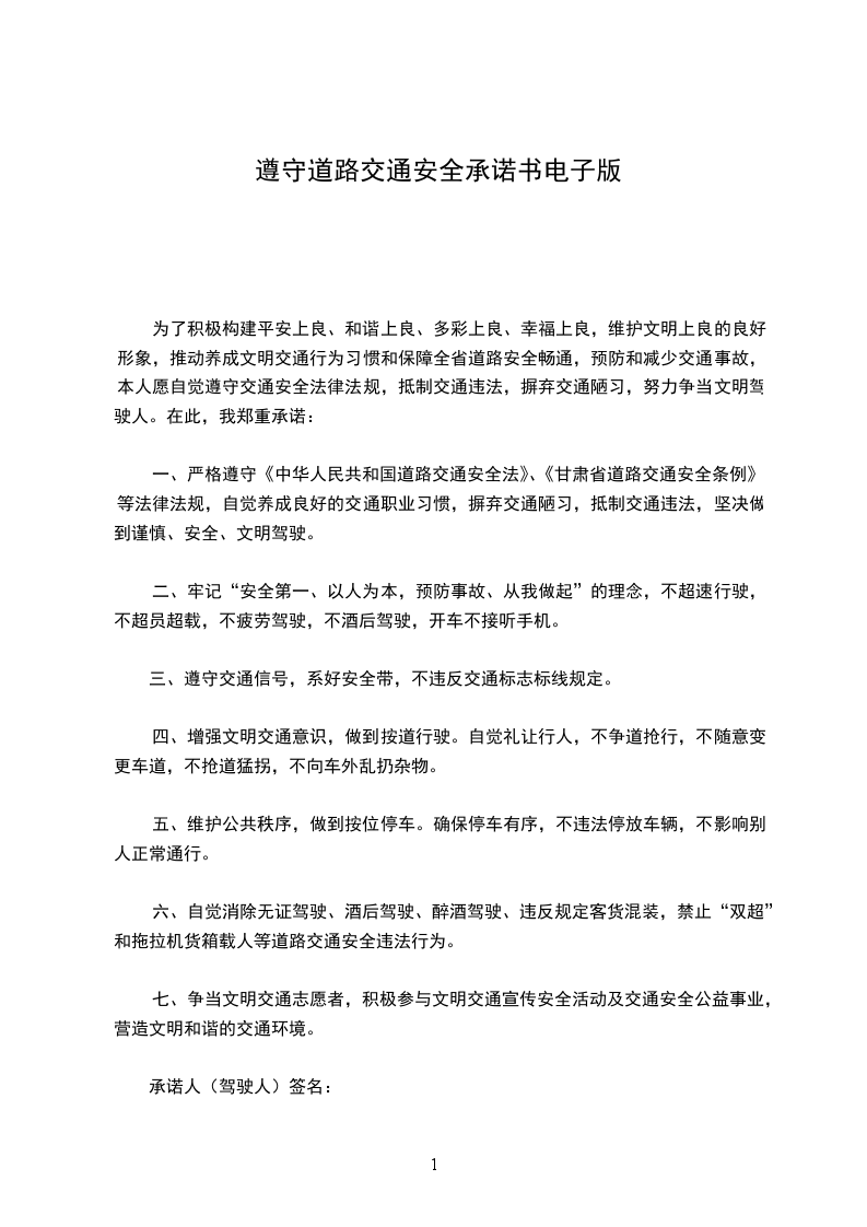 生命无价,安全为先。为了维护道路交通安全秩序,预防和减少道路交通事故,确保生命健康安全,我愿意作出以下承诺: