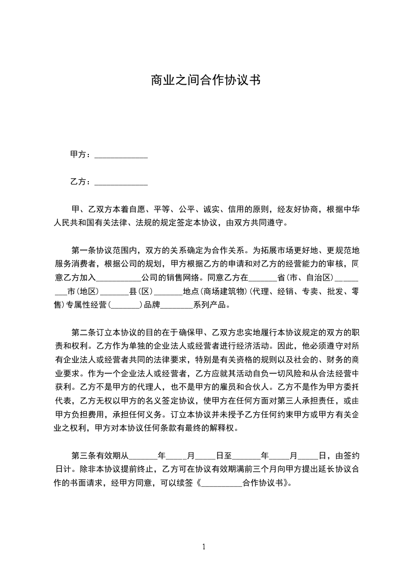 第一条协议范围内,双方的关系确定为合作关系。为拓展市场更好地、更规范地服务消费者,根据公司的规划,甲方根据乙方的申请和对乙方的经营能力的审核,同意乙方加入___________公司的销售网络。同意乙方在_______省(市、自治区)_________市(地区)_______县(区)_______地点(商场建筑物)(代理、经销、专卖、批发、零售)专属性经营(_______)品牌________系列产品。