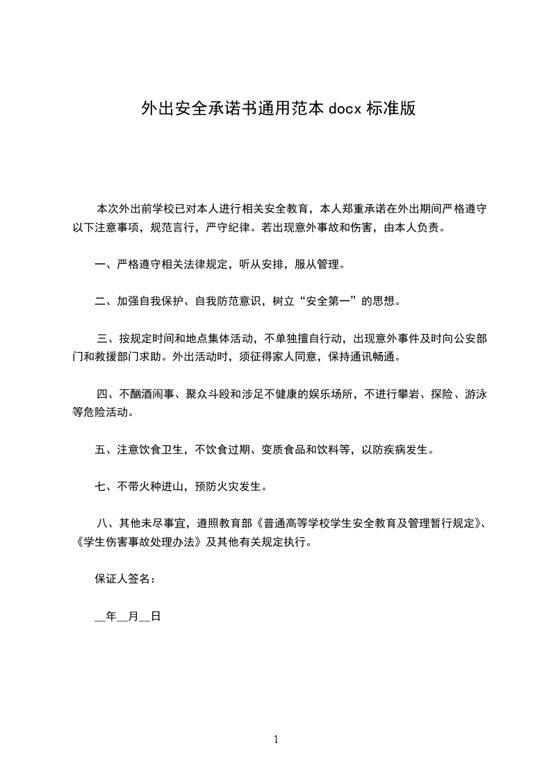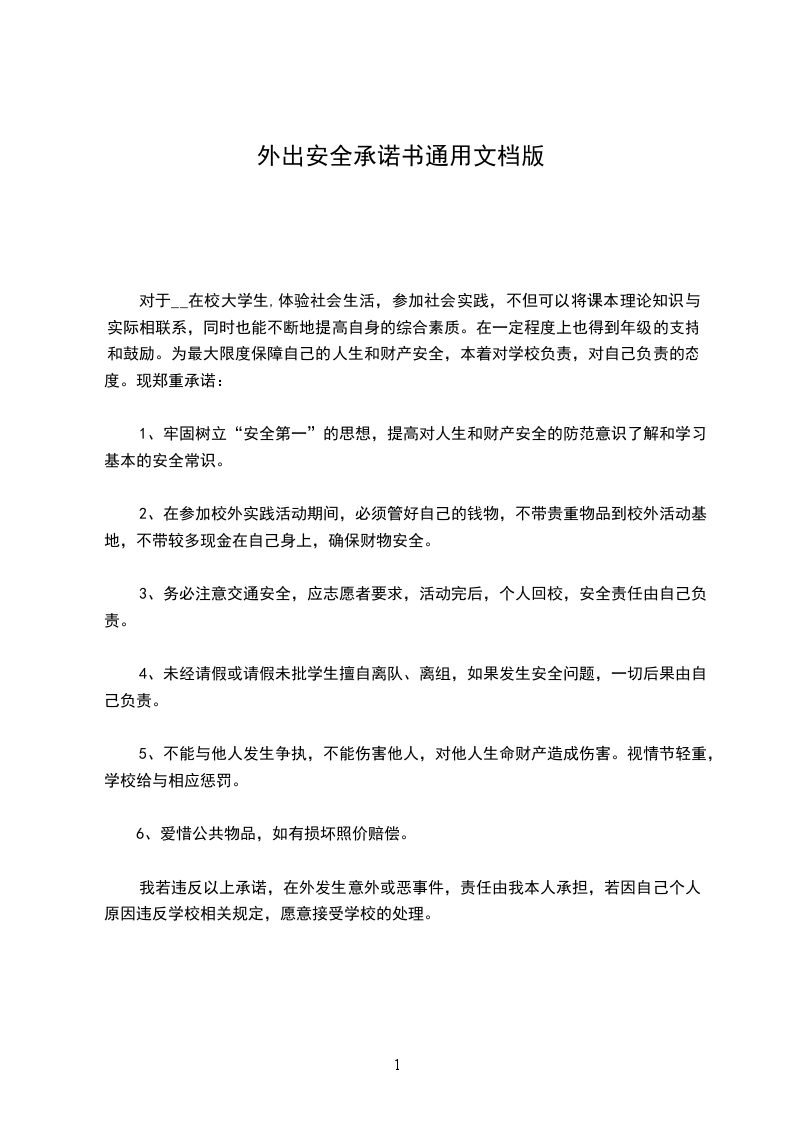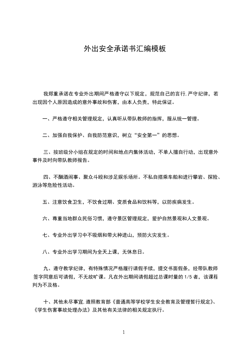 本次外出前学校已对本人进行相关安全教育,本人郑重承诺在外出期间严格遵守以下注意事项,规范言行,严守纪律。若出现意外事故和伤害,由本人负责。