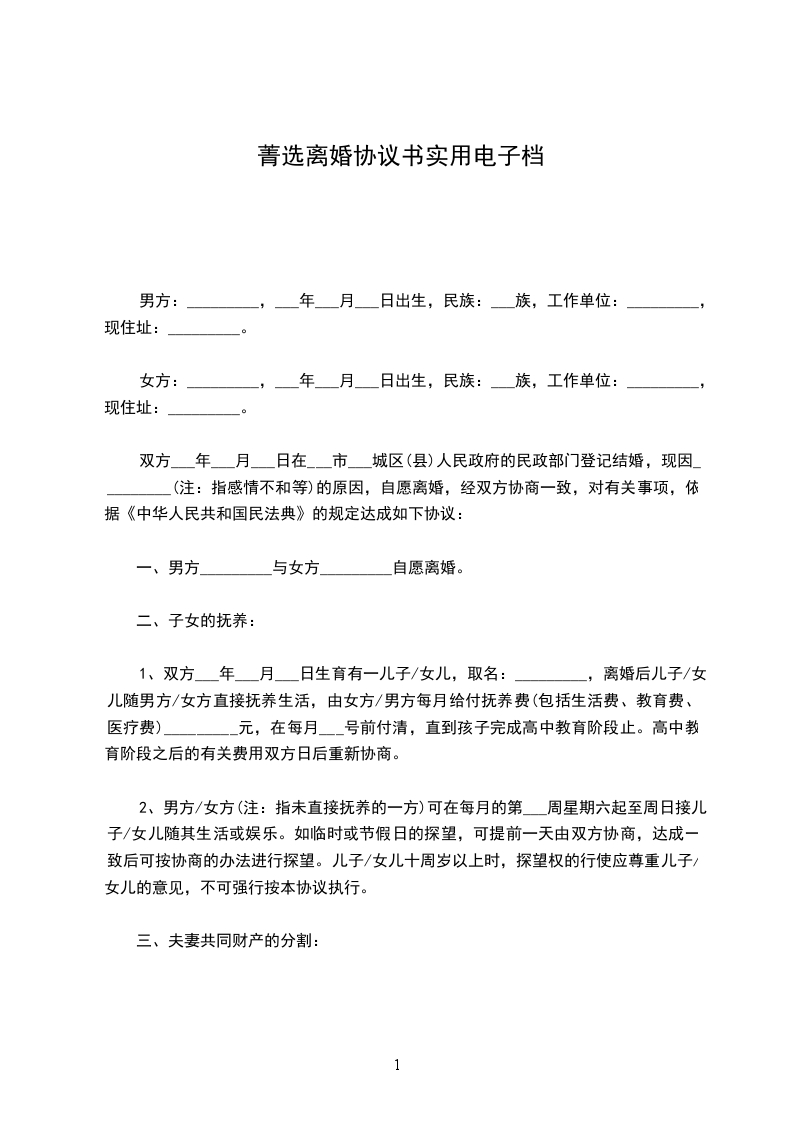 1、双方___年___月___日生育有一儿子/女儿,取名:_________,离婚后儿子/女儿随男方/女方直接抚养生活,由女方/男方每月给付抚养费(包括生活费、教育费、医疗费)_________元,在每月___号前付清,直到孩子完成高中教育阶段止。高中教育阶段之后的有关费用双方日后重新协商。