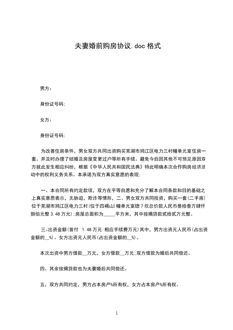 一、本合同所有约定款项,双方在平等自愿和充分了解本合同条款和目的基础之上真实意思表示,无胁迫,欺诈等情形,二、男女双方共同投资,购买一套(二手房)位于芜湖市鸠江区电力三村(位于四褐山)幢单元室牎7坎总价款人民币叁拾叁万肆仟捌佰元整3.48万元);房屋总面积为_____平方米,其中按揭贷款贰拾贰万元整。