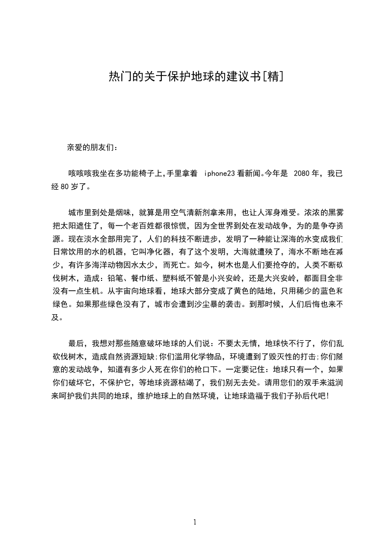 最后,我想对那些随意破坏地球的人们说:不要太无情,地球快不行了,你们乱砍伐树木,造成自然资源短缺;你们滥用化学物品,环境遭到了毁灭性的打击;你们随意的发动战争,知道有多少人死在你们的枪口下。一定要记住:地球只有一个,如果你们破坏它,不保护它,等地球资源枯竭了,我们别无去处。请用您们的双手来滋润,来呵护我们共同的地球,维护地球上的自然环境,让地球造福于我们子孙后代吧!