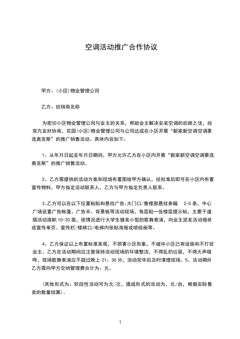 1、从_____年_____月_____日起至_____年_____月_____日期间,甲方允许乙方在小区内开展“新家新空调空调要选奥克斯”的推广销售活动。