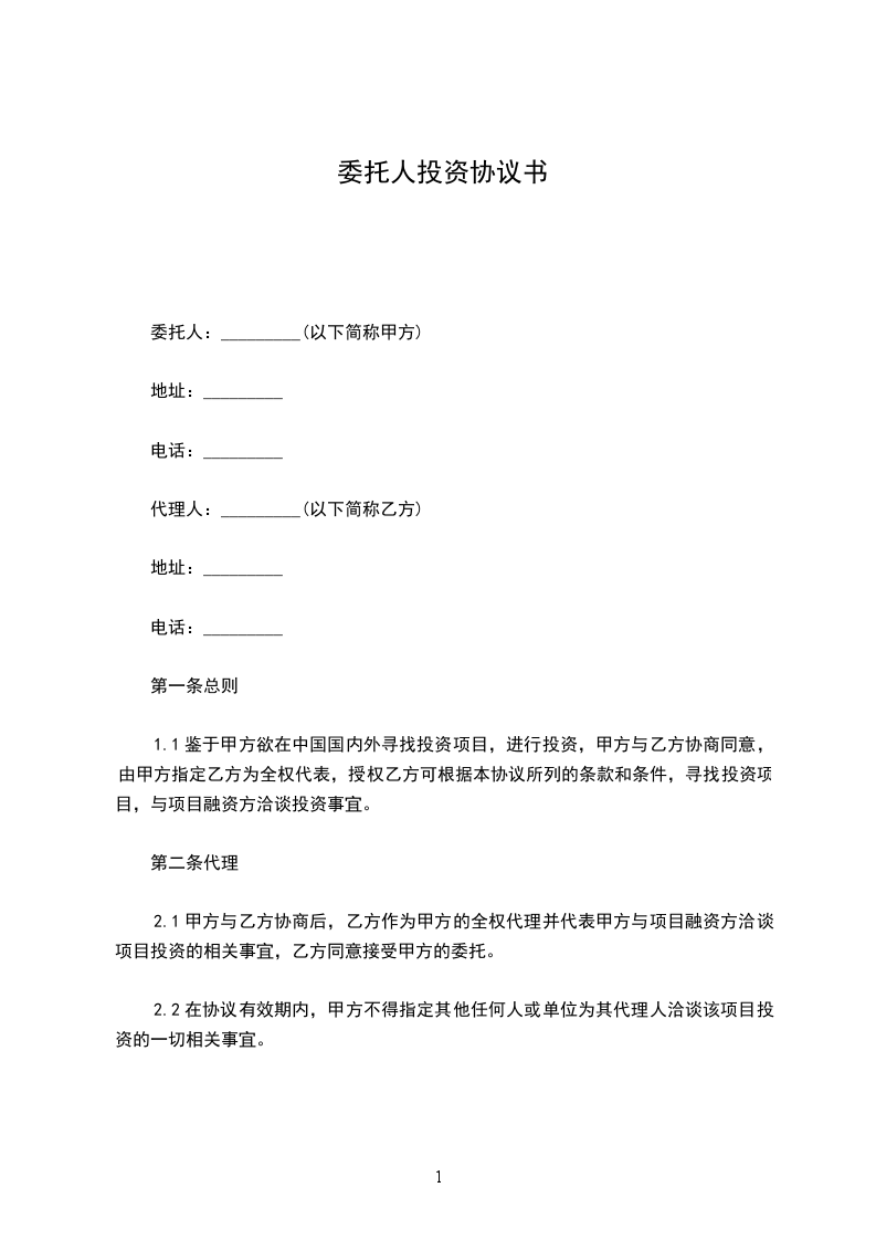 1.1鉴于甲方欲在中国国内外寻找投资项目,进行投资,甲方与乙方协商同意,由甲方指定乙方为全权代表,授权乙方可根据本协议所列的条款和条件,寻找投资项目,与项目融资方洽谈投资事宜。