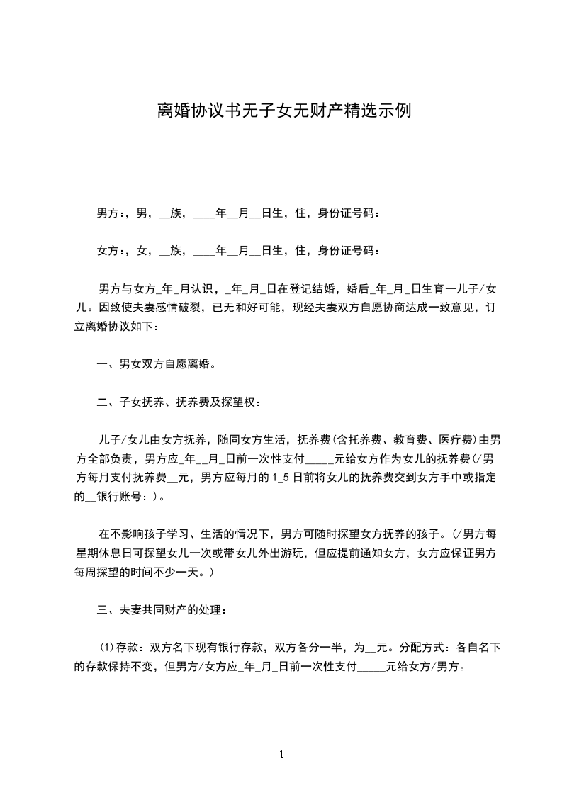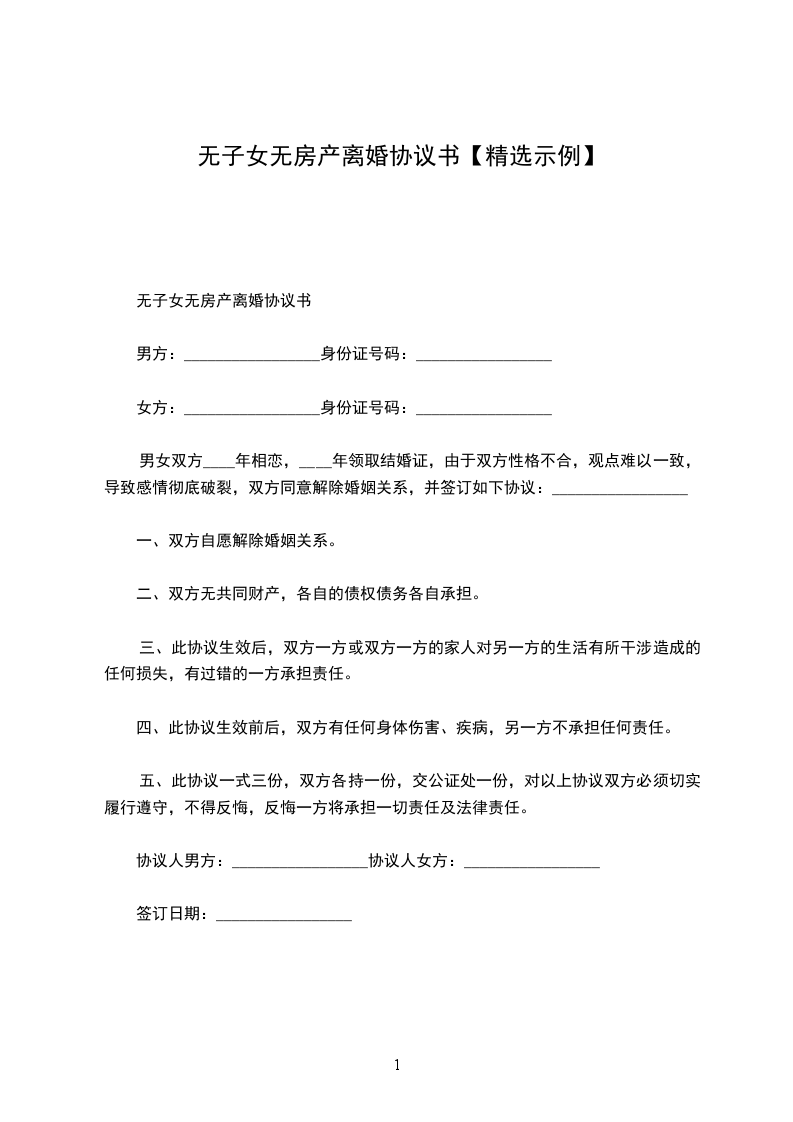 双方20____年__月__日在__市人民政府的民政部门登记结婚,婚后无子女,因双方性格不和,无法共同生活,自愿离婚,经双方协商一致,订立离婚协议如下: