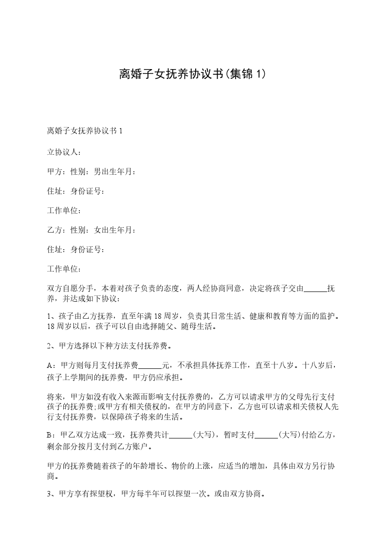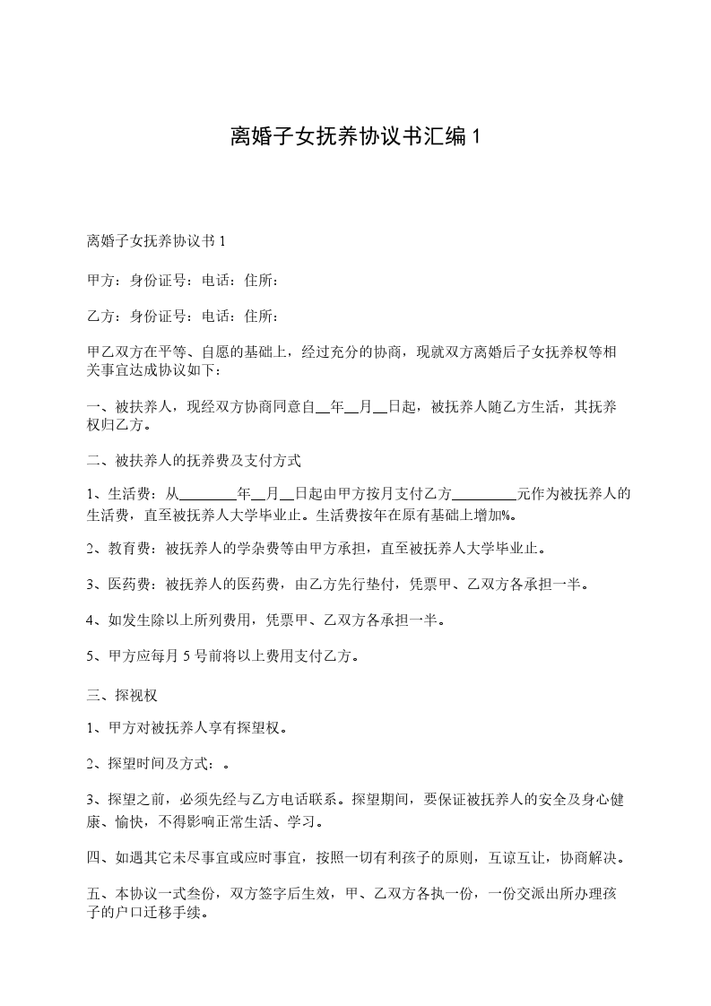 离婚子女抚养协议书1