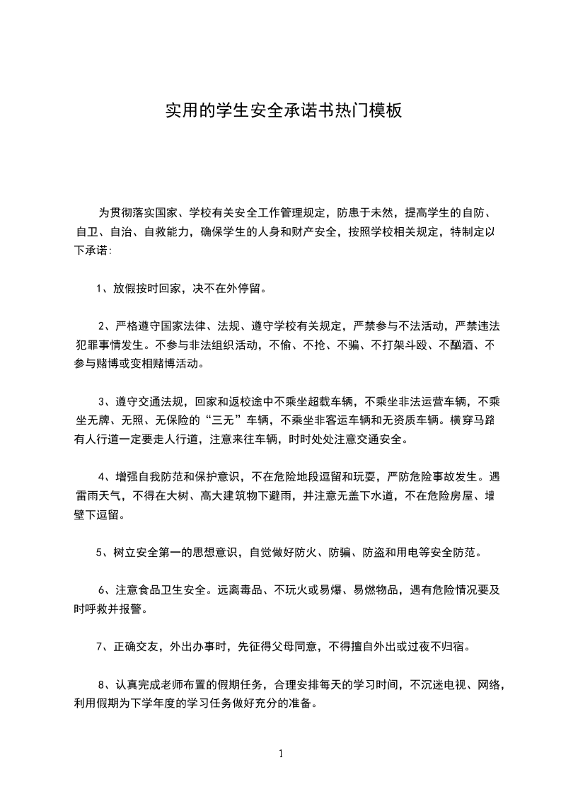 为贯彻落实国家、学校有关安全工作管理规定,防患于未然,提高学生的自防、自卫、自治、自救能力,确保学生的人身和财产安全,按照学校相关规定,特制定以下承诺: