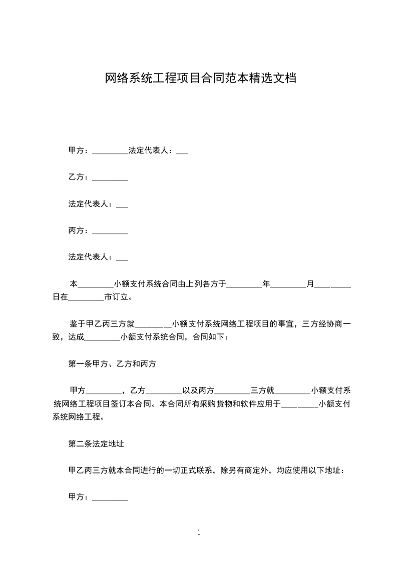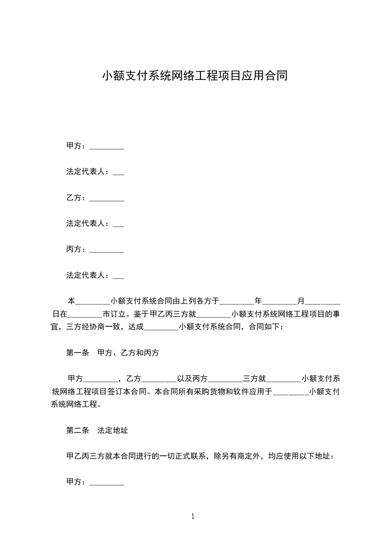 甲方_________,乙方_________以及丙方_________三方就_________小额支付系统网络工程项目签订本合同。本合同所有采购货物和软件应用于某_______小额支付系统网络工程。