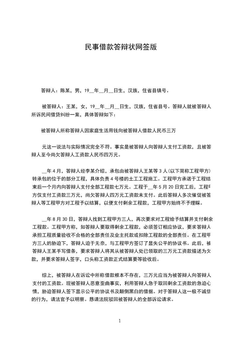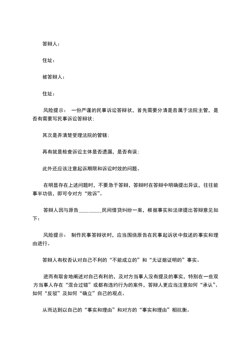 被答辩人:王某,女,19__年__月__日生,汉族,住省县号。答辩人就被答辩人所诉民间借贷纠纷一案,具体答辩如下:
