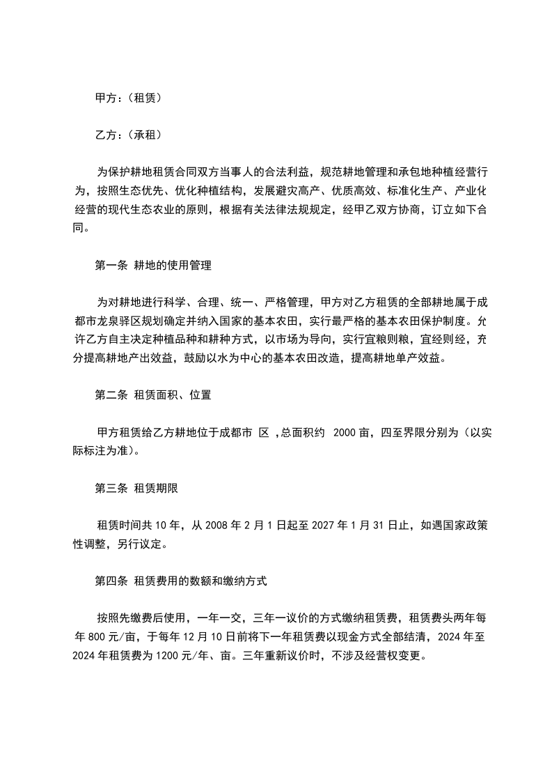 为保护耕地租赁合同双方当事人的合法利益,规范耕地管理和承包地种植经营行为,按照生态优先、优化种植结构,发展避灾高产、优质高效、标准化生产、产业化经营的现代生态农业的原则,根据有关法律法规规定,经甲乙双方协商,订立如下合同。