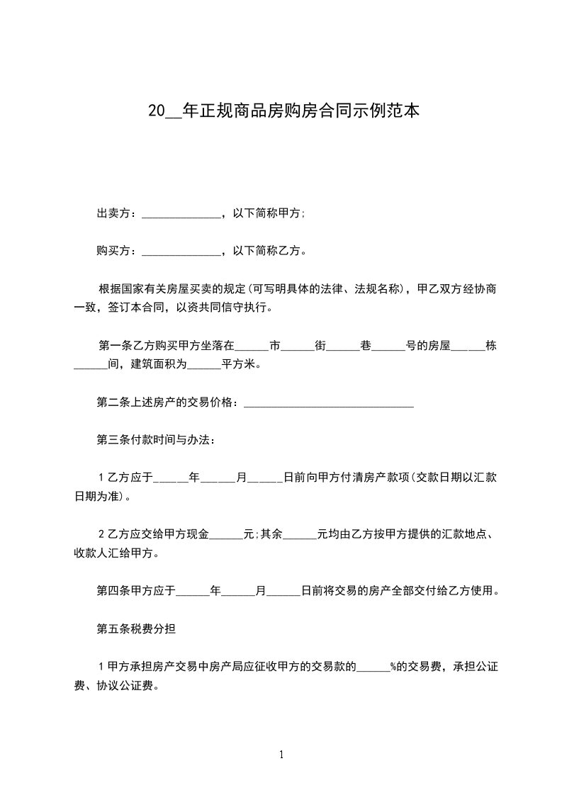第一条乙方购买甲方坐落在______市______街______巷______号的房屋______栋______间,建筑面积为______平方米。