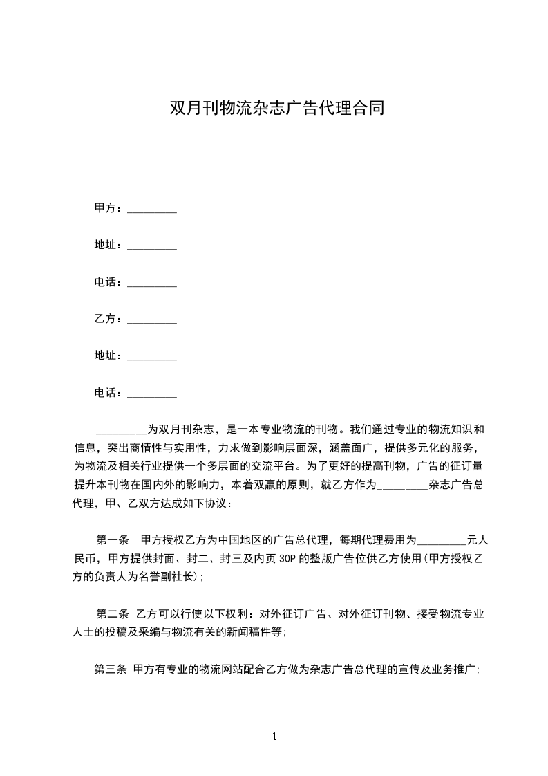 一、甲方接受乙方的委托,试销乙方_________杂志在_________地区三个月的试销业务。