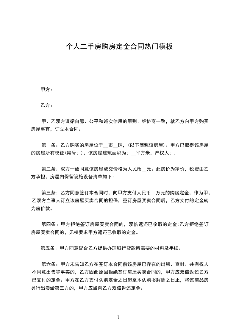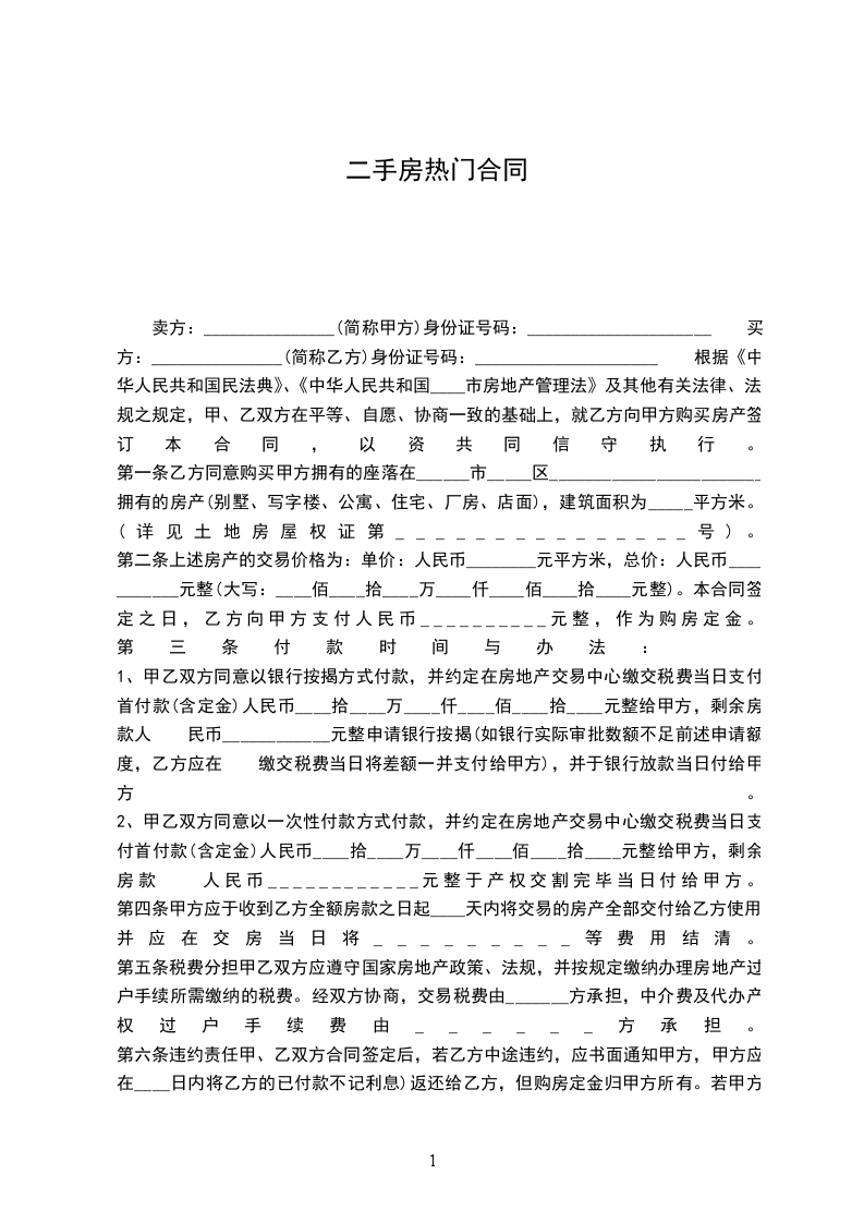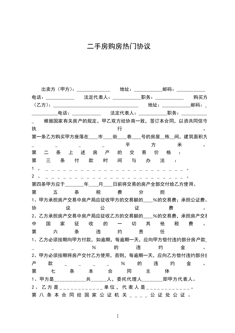 第一条乙方购买甲方坐落在_______________市__________街__________巷_________号的房屋__________栋_______间,建筑面积为______________平方米。