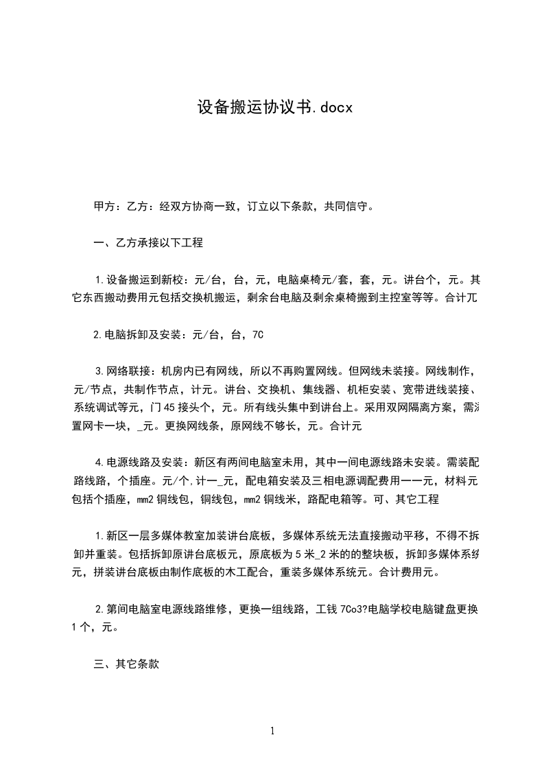 1、设备搬运到新校:_________元/台,_________台,_________元,电脑桌椅_________元/套,_________套,_________元。讲台_________个,_________元。其它东西搬动费用_________元(包括交换机搬运,剩余_________台电脑及剩余桌椅搬到主控室等等)。合计_________元。