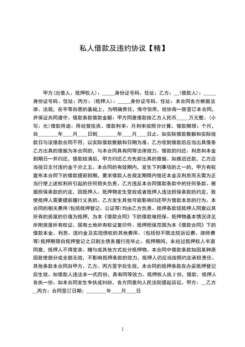 甲方(出借人、抵押权人):_____身份证号码、住址:乙方:__(借款人):_____身份证号码、住址:丙方:(抵押人):_____身份证号码、住址:本合同各方根据法律、法规,在平等自愿的基础上,为明确责任,恪守信用,经协商一致签订本合同,并保证共同遵守。借款条款借款金额:甲方同意借款给乙方人民币_____万元整。(小写:元)借款用途:用经营投资。借款利率:月利率按照分计算。借款期限:个月,自________年____月____日到________年____月____日止。如实际借款数额和实际放款日与该借款合同不符,以实际借款数额和日期为准。乙方收到借款后应当出具借条,乙方出具的借据为本合同的,与本合同具有同等法律效力。借款的归还:利息和本金到期日一并归还,借款结清后,甲方归还乙方先前出具的借据。如推迟还款,乙方应当按日支付违约金千分之五。本合同的有效期内,发生下列事项的之一的,甲方有权宣布本合同下的借款提前到期,要求借款人在规定期限内偿还本金及利息而无需为正当行使上述权利所引起的任何损失负责。乙方违反本合同借款条款中的任何条款。根据担保条款的约定,因抵押人、抵押物发生变故或者抵押人违法担保条款的约定,致使抵押人需要提前履行义务的。乙方发生其他可能影响归还甲方借款本息的行为。本合同的相关费用(包括抵押登记、公证等)均由乙方负责。抵押条款现抵押人同意以其所有的房屋的价值为抵押,为本《借款合同》下的借款做担保。抵押物基本情况详见所附房屋所有权证、国有土地所有权证复印件。抵押担保范围为本《借款合同》下的借款本金、利息、违约金及实现债权的其他费用。(包括但不限法院诉讼费、律师费等)抵押期限自抵押登记之日到主债务履行完毕止。抵押期间,未经过抵押权人书面同意,抵押人不得变卖、赠与或其他方式处分抵押物。本合同中借款条款如因某种原因致使部分或全部无效,不影响抵押条款的效力,抵押人仍应当按照约定承担责任。其他条款本合同自甲方、乙方、丙方签字后生效,本合同的抵押条款在办妥抵押登记后生效。如借款人违法本一式四份,具有同等效力。抵押权人执2份,借款、抵押人各执一份。如本合同发生争执或纠纷,各方同意向人民法院提起诉讼。甲方:__乙方:__丙方:合同签订日期:________年____月____日