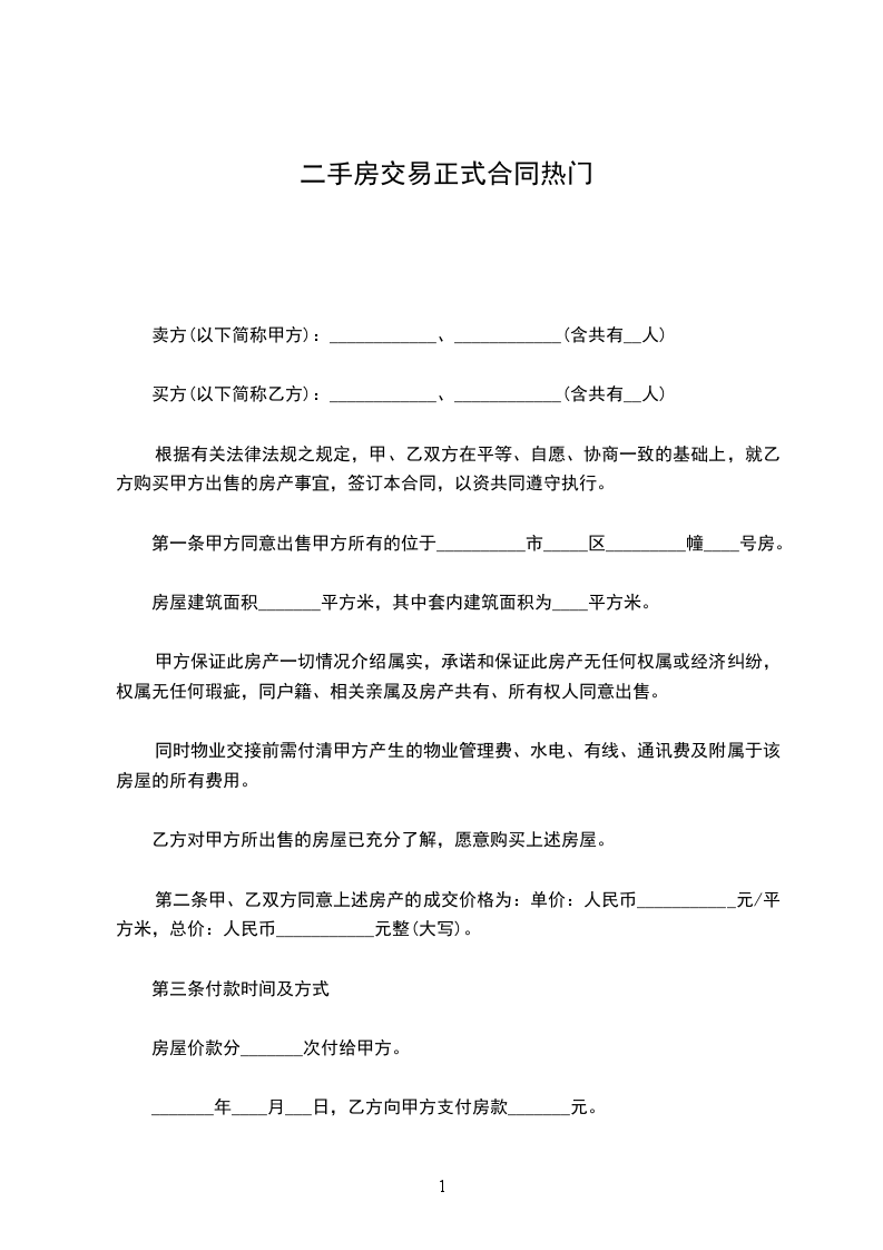 第二条甲、乙双方同意上述房产的成交价格为:单价:人民币___________元/平方米,总价:人民币___________元整(大写)。