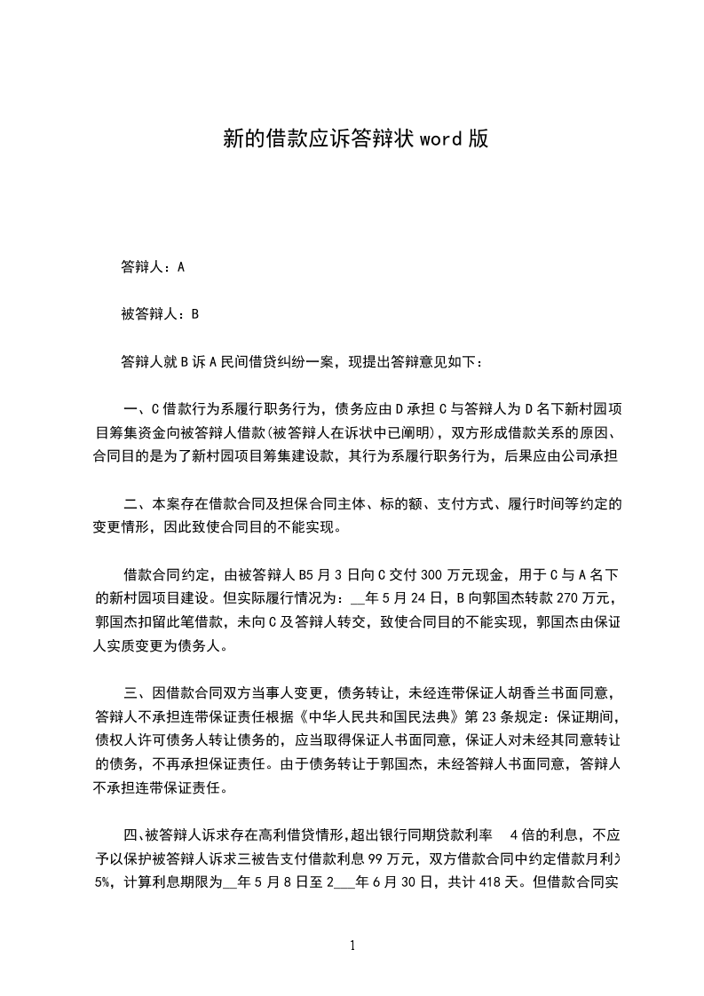 答辩人就B诉A民间借贷纠纷一案,现提出答辩意见如下: