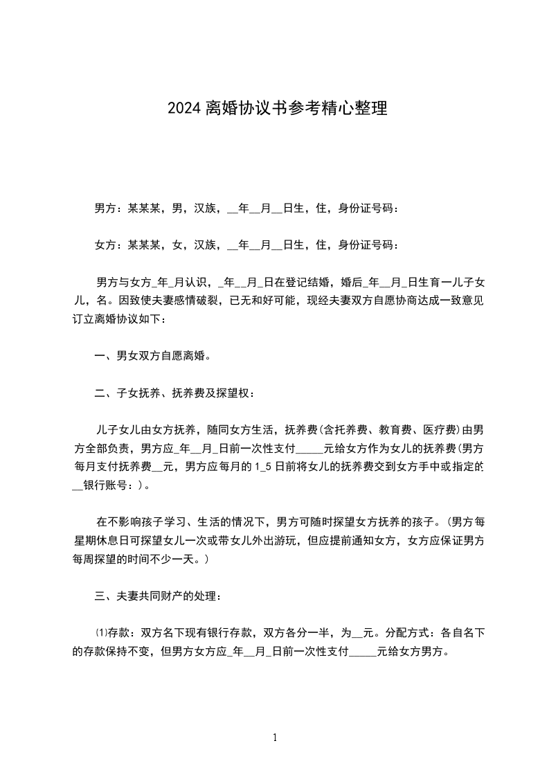 双方____年__月认识,____年__月__日在____登记结婚,婚后____年__月__日生育一儿子,名__.现夫妻感情已经完全破裂,没有和好可能,经双方协商达成一致意见,订立离婚协议如下: