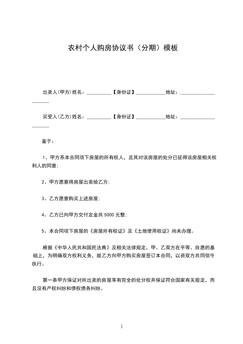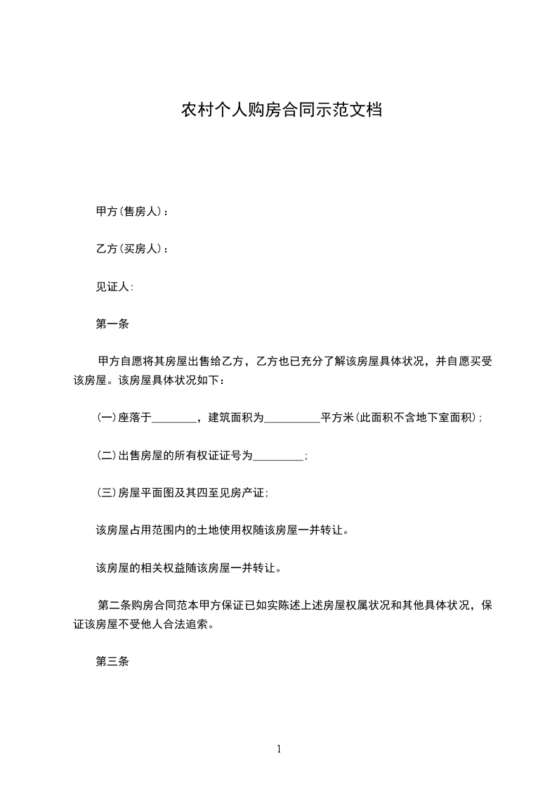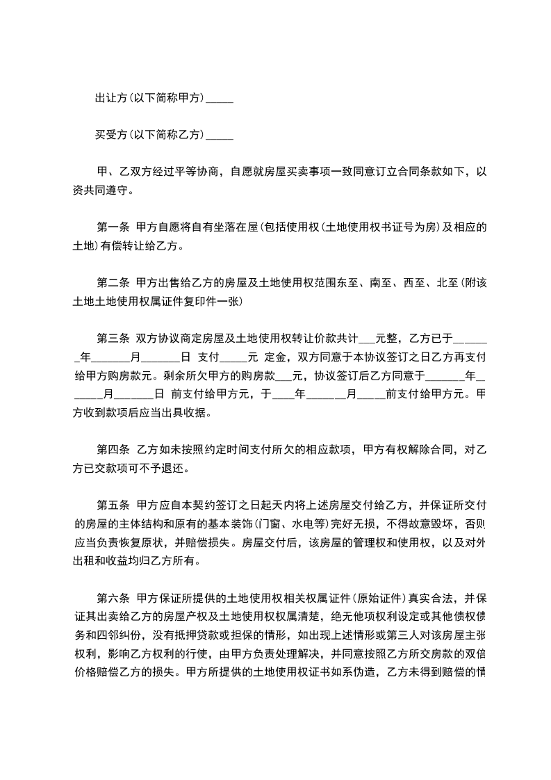 一、甲方将其拥有独立产权的位于____市____区的房屋(房屋所有权证编号:___________________,建筑面积____平方米)以人民币__仟__佰__拾__万__仟__佰__拾__元整(¥__元整)出售给乙方。