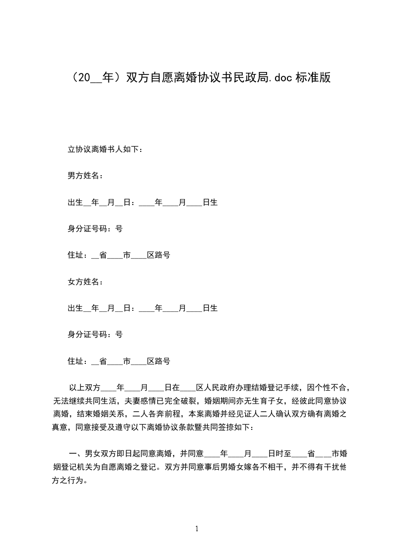 一、男女双方即日起同意离婚,并同意____年____月____日时至____省____市婚姻登记机关为自愿离婚之登记。双方并同意事后男婚女嫁各不相干,并不得有干扰他方之行为。