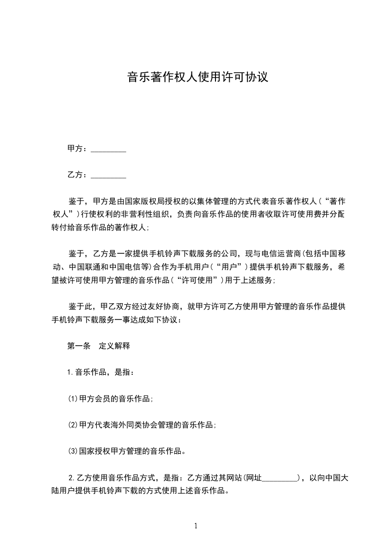 鉴于,乙方是一家提供手机铃声下载服务的公司,现与电信运营商(包括中国移动、中国联通和中国电信等)合作为手机用户(“用户”)提供手机铃声下载服务,希望被许可使用甲方管理的音乐作品(“许可使用”)用于上述服务;