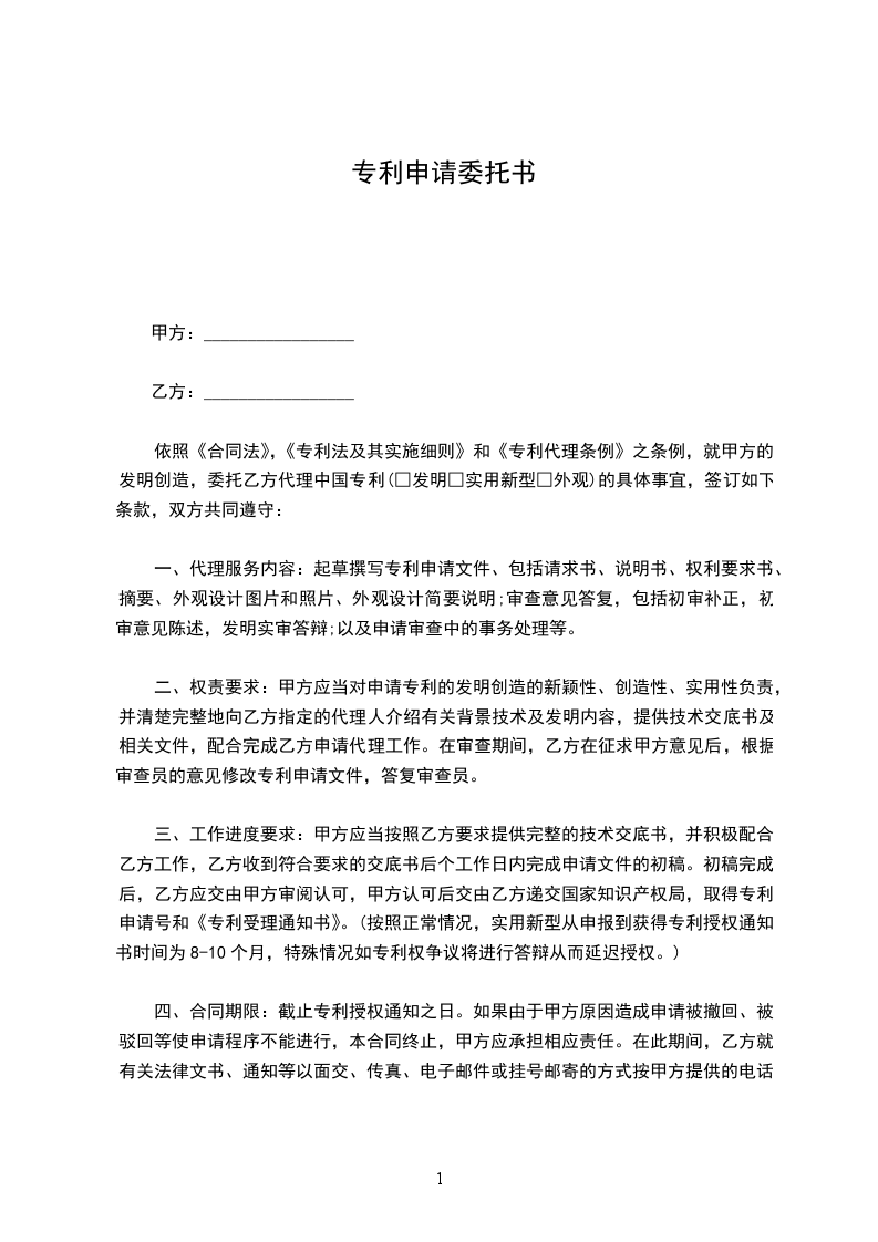 委托人_________因名称为_________的(发明、实用新型、外观设计)专利申请一案,委托_________指派专利代理人_________为本人(单位)的代理人。经友好协商达成如下协议: