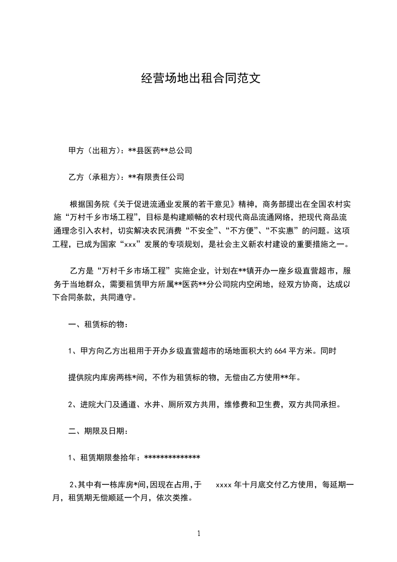 乙方是“万村千乡市场工程”实施企业,计划在**镇开办一座乡级直营超市,服务于当地群众,需要租赁甲方所属**医药**分公司院内空闲地,经双方协商,达成以下合同条款,共同遵守。
